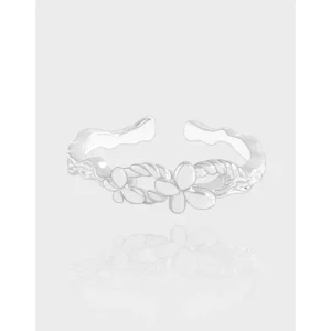 - Patterns & Textures: The ring showcases a beautifully intertwined composition, with one side sculpted into a delicate braided or twisted rope texture. Adorning the band are charming clusters of small, rounded flowers and subtle leaf-like accents, all resting on an organically wavy band.