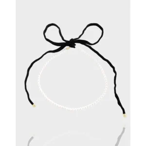 - Color: The necklace features a striking contrast of deep, velvety black ribbon, reminiscent of the mystery of the night sky, paired with a luminous strand of pure white pearls. Subtle golden accents at the ribbon tips and center knot add a touch of refined celestial glow, embodying the essence of light amidst darkness.