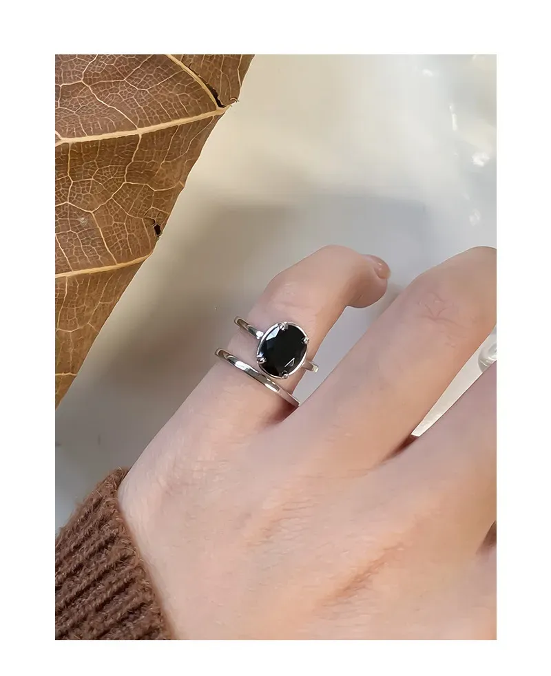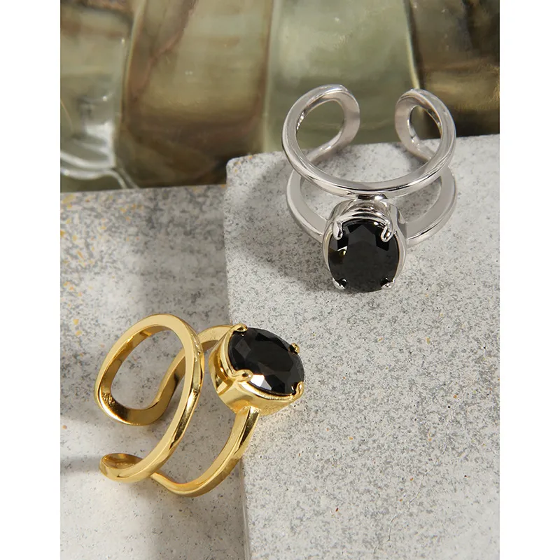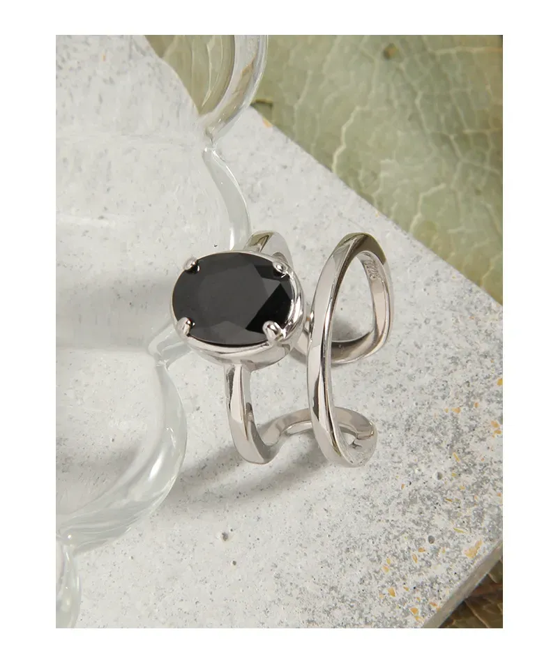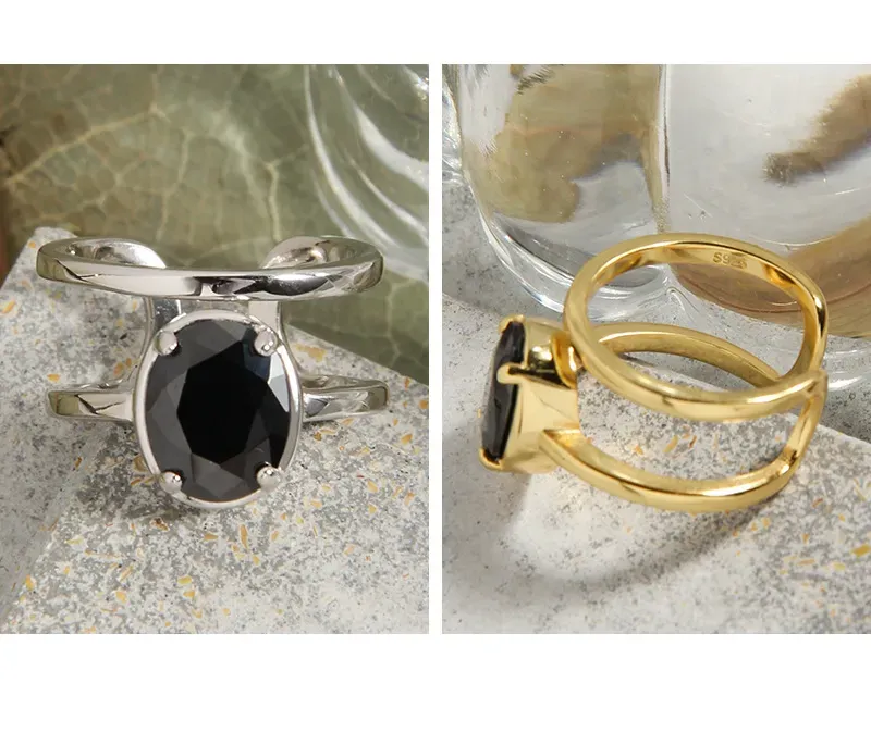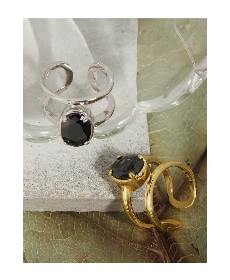 Patterns & Textures: The smooth, highly polished surface of the gold bands exudes a luxurious, liquid-like sheen. The central black gemstone, securely set, presents a sleek and deep texture, captivating with its singular, profound hue rather than intricate patterns, reminiscent of nature’s unadorned artistry.