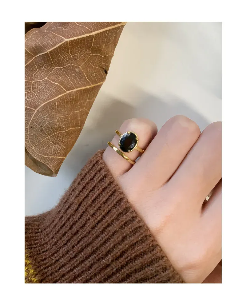Color: This captivating ring boasts a radiant gold-toned finish, meticulously polished to a high shine. It cradles a mesmerizing, deep black oval-cut gemstone, echoing the profound stillness and depth of a starlit night sky.