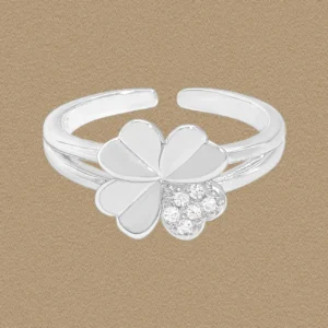 - Patterns or Textures: The ring band boasts a smooth, polished texture, highlighting its luminous silver finish. The clover’s petals display a captivating contrast: three petals feature a sleek, subtly divided white surface, while the fourth petal is intricately adorned with a constellation of small, round, brilliant-cut stones, creating a dazzling, textured sparkle that captures the essence of a starlit sky.