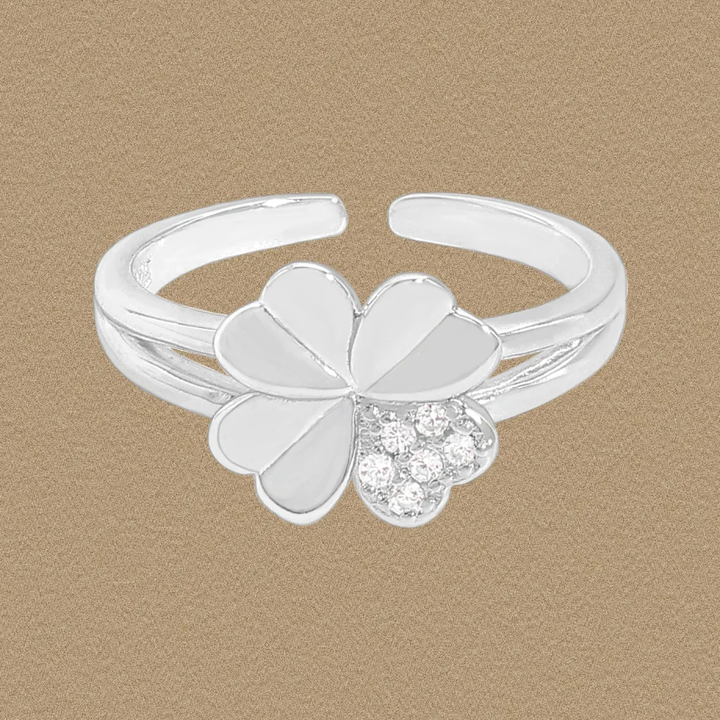 - Color: The ring shines in a lustrous silver tone, reminiscent of moonlight or the pristine glow of distant stars. Its four-petal centerpiece elegantly combines smooth, pristine white petals with a contrasting cluster of brilliant, clear stones, creating a celestial sparkle.