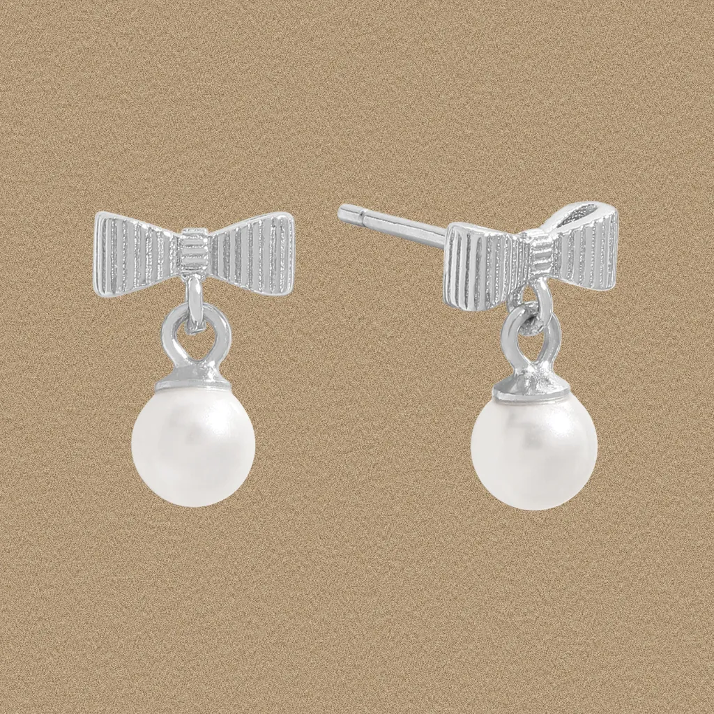 Suspended gracefully from each textured bow is a luminous, spherical white pearl. Its smooth, iridescent surface beautifully contrasts with the bow’s tactile finish, embodying the celestial hues and depth of natural gemstones. Much like the ethereal glow and ever-changing brilliance of the aurora borealis, the pearl captures and reflects light, adding a touch of magic and subtle shimmer reminiscent of the night sky.