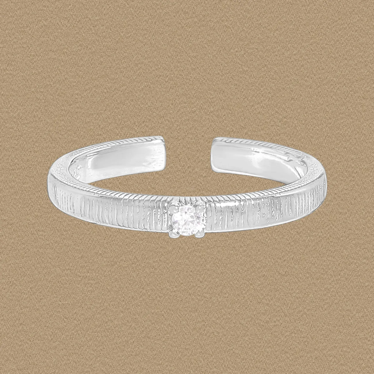 The band is adorned with a captivating vertical ribbed texture, reminiscent of natural striations or the delicate lines etched by time on ancient surfaces. This raw, tactile finish imbues the ring with an authentic, organic character, celebrating the imperfect beauty of nature’s patterns. The edges subtly echo this detail, creating a cohesive and enriching sensory experience.