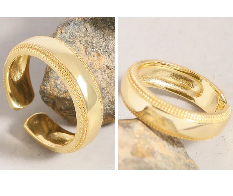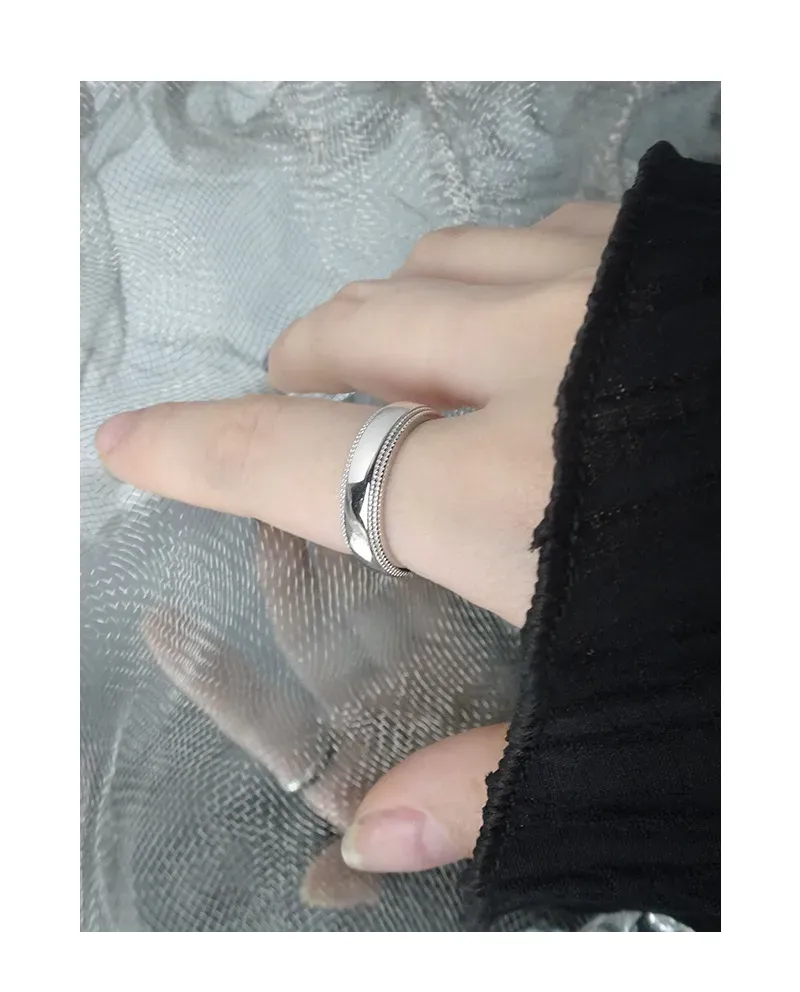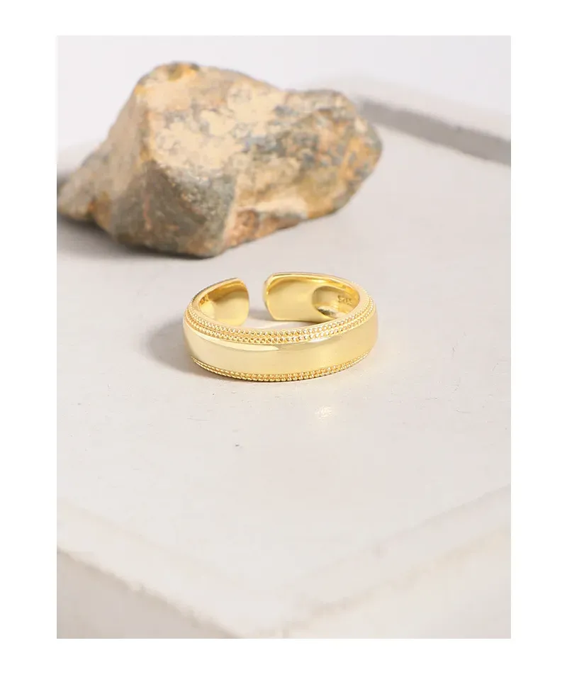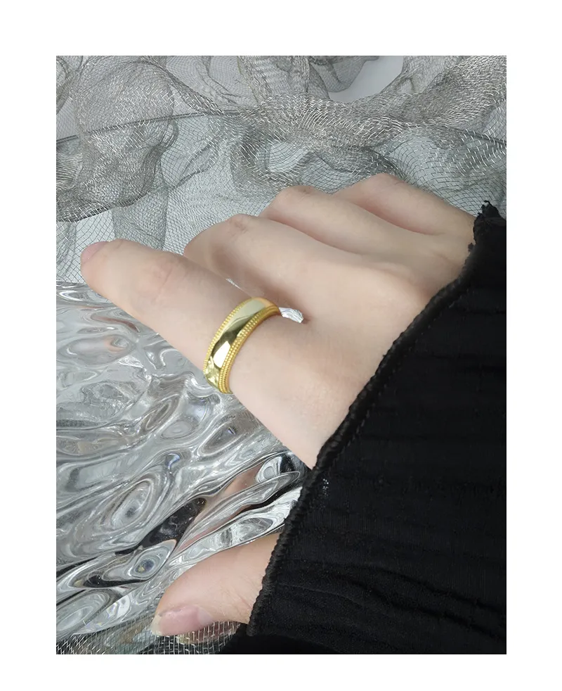 The ring features a beautifully smooth, polished central band that captures and reflects light. This sleek surface is framed by two delicate rows of intricately beaded milgrain texture along both the upper and lower edges, adding a sophisticated pattern and enhancing its overall elegance.
