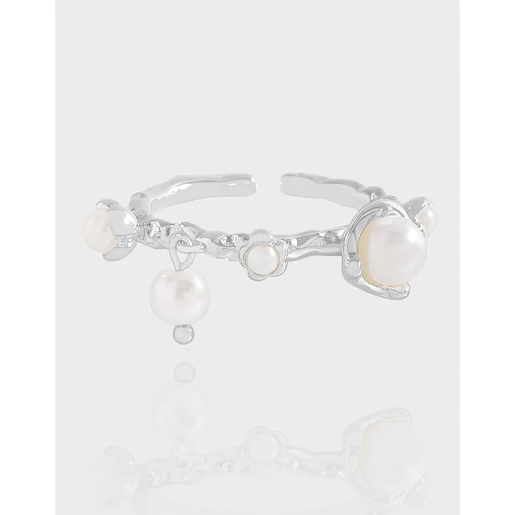- Patterns & Textures: The band features an exquisitely sculpted, raw, and irregular texture, reminiscent of a natural twig or branch. Adorning this organic base are charming blossom-like settings, some cradling smaller pearls, while a prominent, larger pearl is elegantly nestled within a sculpted leaf-like motif. A beautiful pearl teardrop delicately dangles, adding movement and a touch of refined grace.