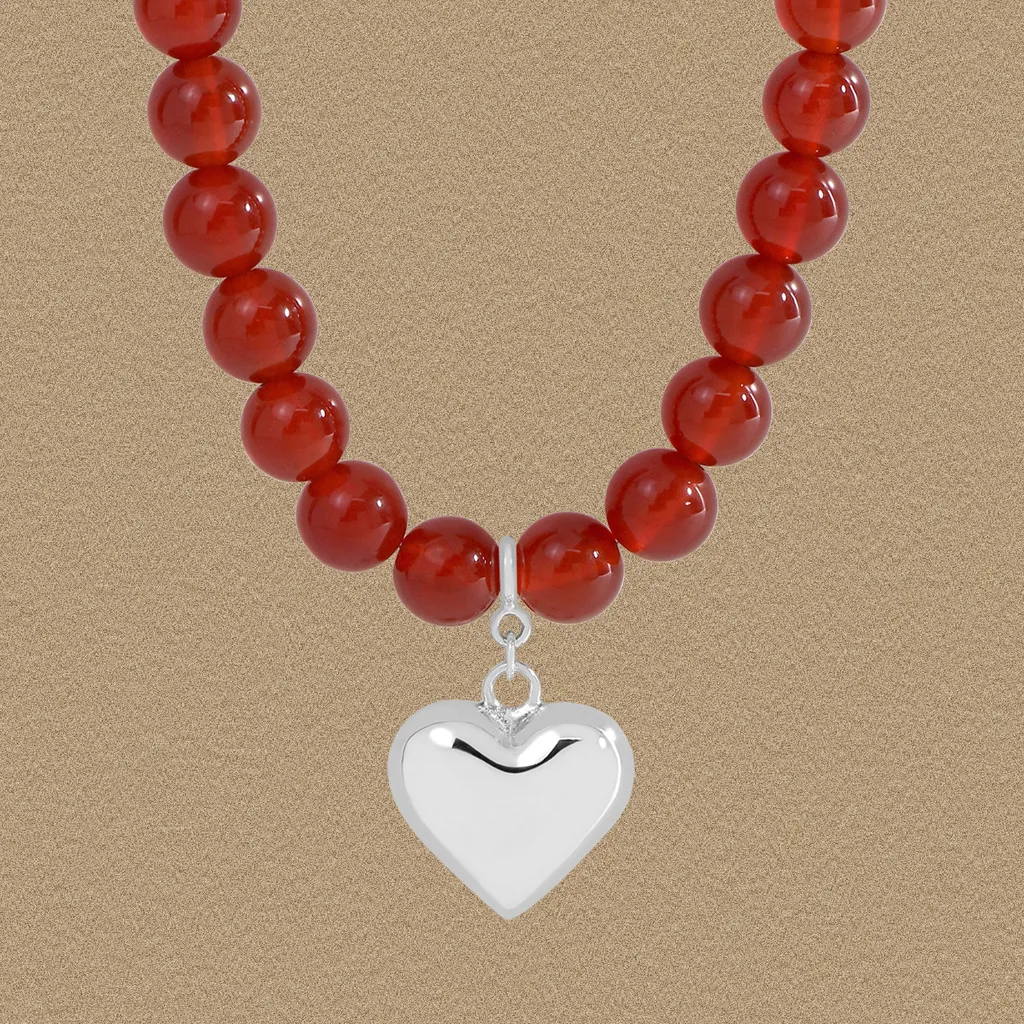- Color: Vibrant, deep red carnelian beads; brilliant, polished sterling silver heart.