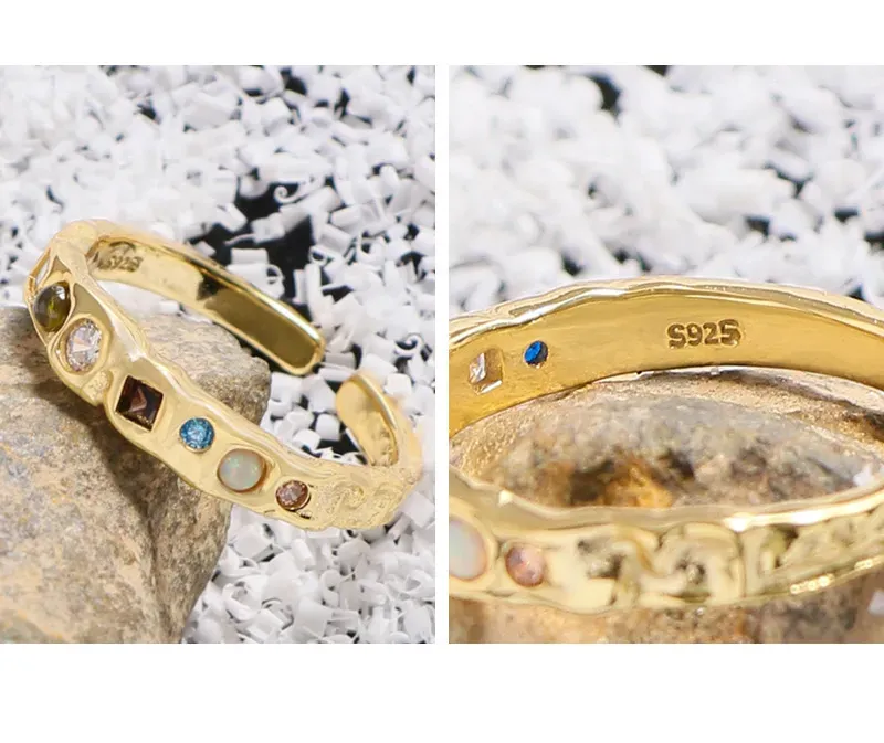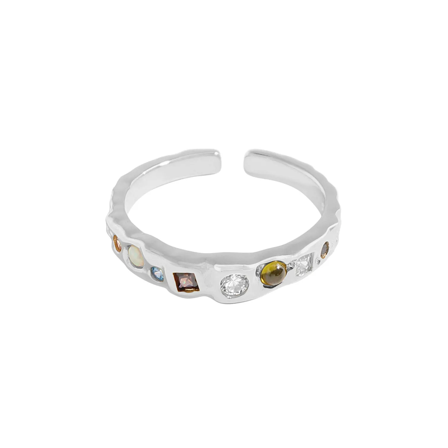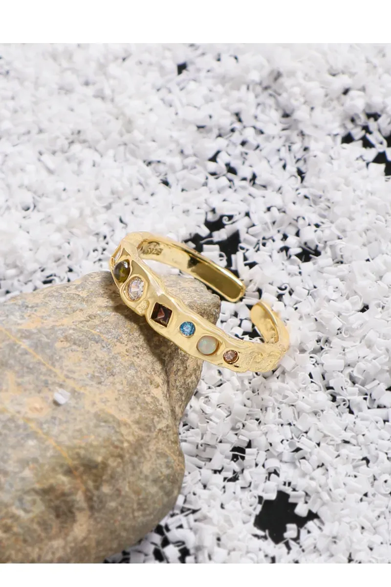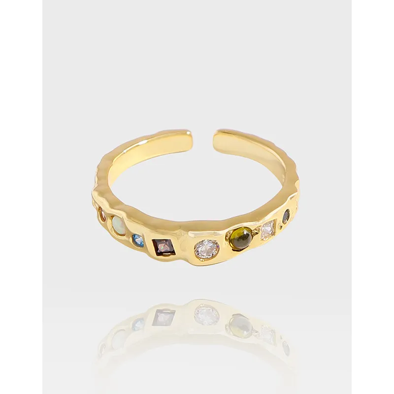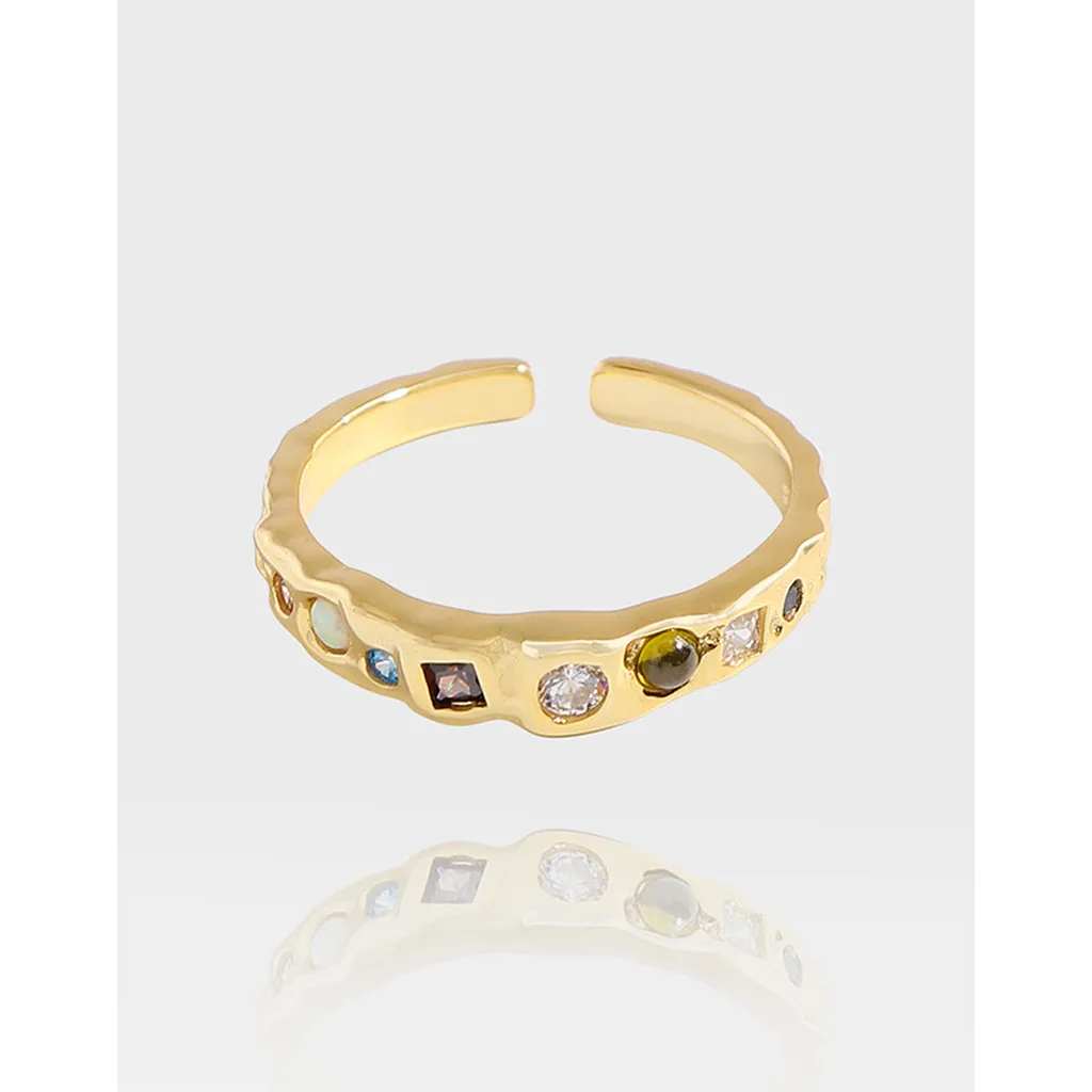 The Telindra Ring features a lustrous gold-toned metal band, serving as a warm, radiant canvas for an array of captivating, multi-hued gemstones. These include sparkling clear, soft opalescent white, serene light blue, rich brown/maroon, vibrant olive green, and deep navy/black hues, creating a harmonious and vibrant palette.
