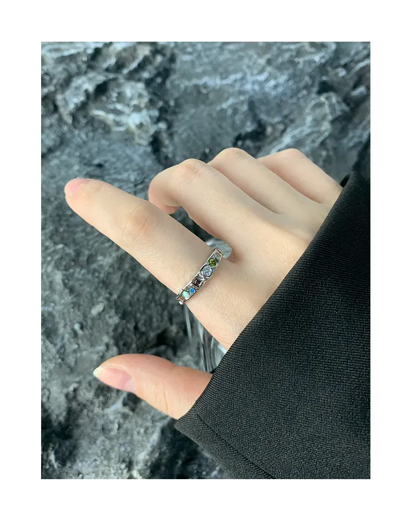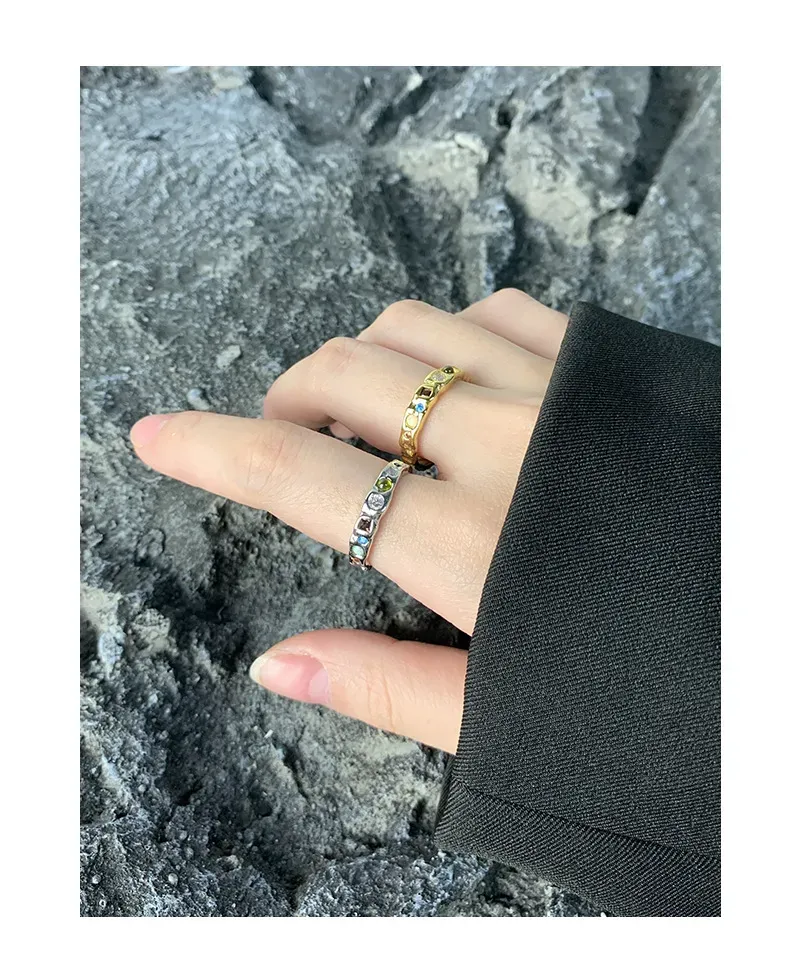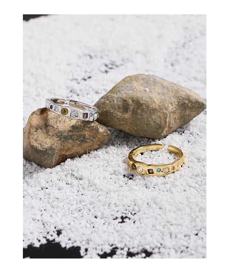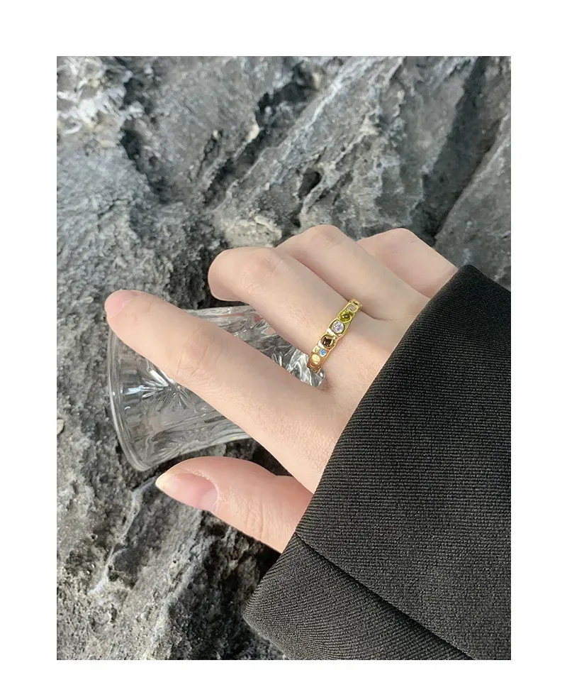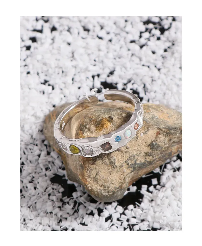 The Telindra Ring features a lustrous gold-toned metal band, serving as a warm, radiant canvas for an array of captivating, multi-hued gemstones. These include sparkling clear, soft opalescent white, serene light blue, rich brown/maroon, vibrant olive green, and deep navy/black hues, creating a harmonious and vibrant palette.