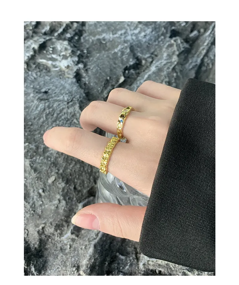 The band showcases a distinctive, raw and organic texture, reminiscent of earth’s natural contours or a softly hammered finish, celebrating the imperfect beauty of nature’s patterns. Across this textured surface, a mesmerizing “celestial dance” unfolds with individually set gemstones. These gems vary intentionally in shape (including round and square cuts) and size, creating an irregular, constellation-like pattern that mirrors the scattered brilliance of starlight in the night sky.