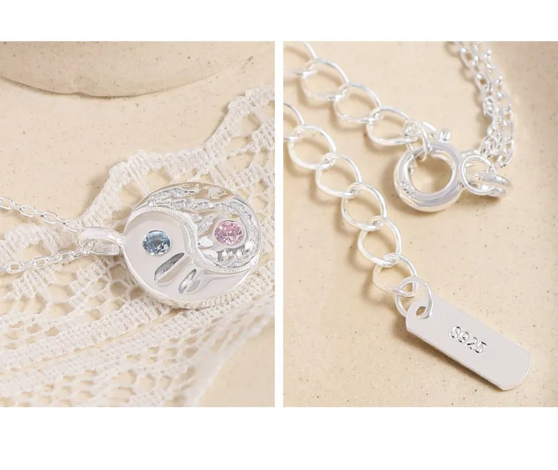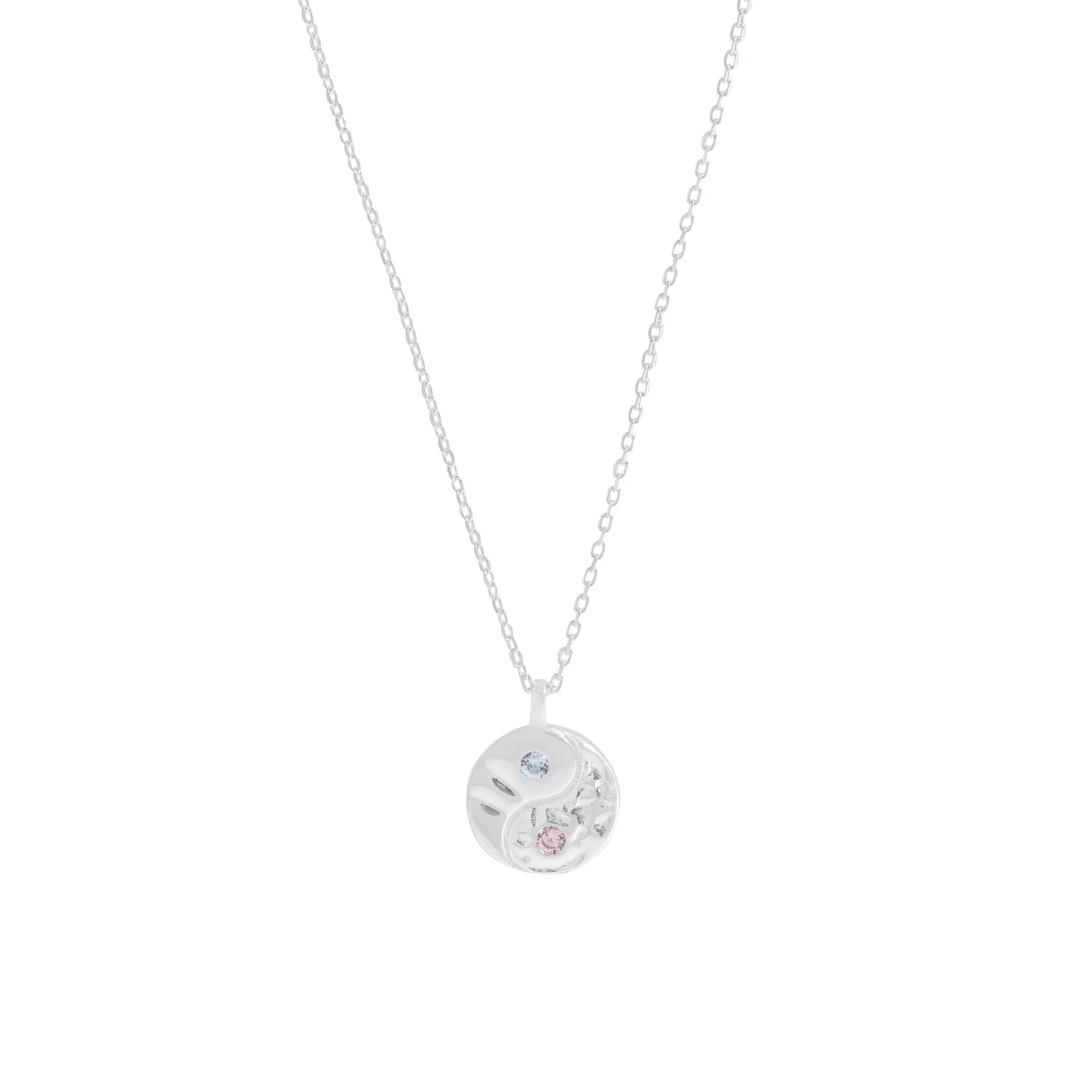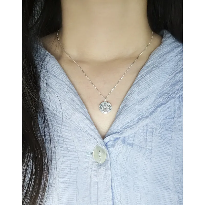 - Patterns & Textures: The circular pendant boasts a captivating design, divided into two distinct halves. One side features a richly textured, organic surface reminiscent of a starry night sky or a lunar landscape, with a charming pink gemstone nestled within. The opposing half exhibits a smoother, yet subtly hammered or fluid texture, housing a tranquil light blue gemstone. These raw, imperfect textures and fluid shapes perfectly capture the essence of nature’s beauty and the shimmering mystery of the night sky.