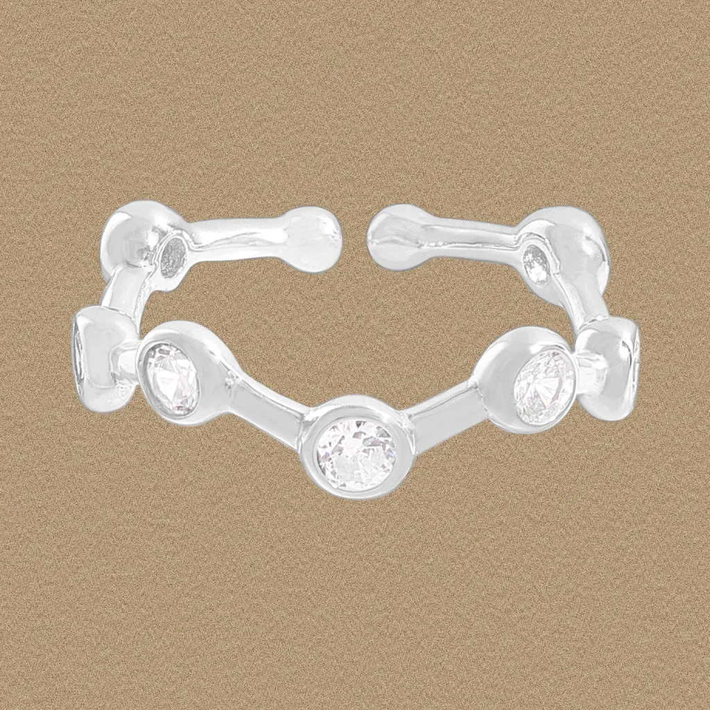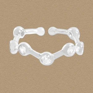 - Patterns & Textures: The polished metal forms a series of connected spheres and bezel settings, each holding a faceted clear stone. This creates a captivating pattern of alternating smooth curves and celestial sparkle, echoing the imperfect beauty found in nature’s artistry.