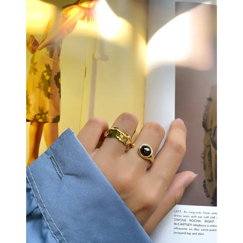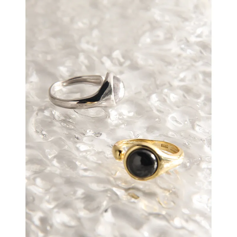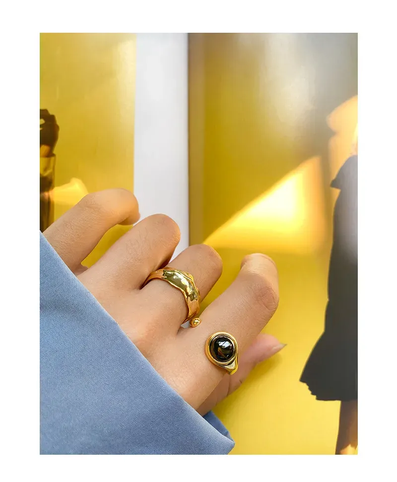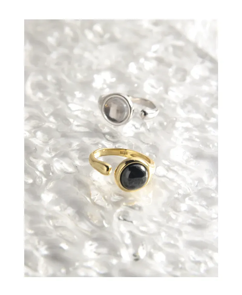 • Patterns or Textures: The smooth, highly polished metal band, whether gold or silver, creates a refined luster. Each gemstone, carefully selected for its unique beauty, boasts a distinct character. The black gemstone offers a sleek, mirror-like finish, while the light grey stone reveals subtle, intrinsic cloud-like patterns and depth, capturing the raw textures and imperfect beauty found in nature’s artistry.