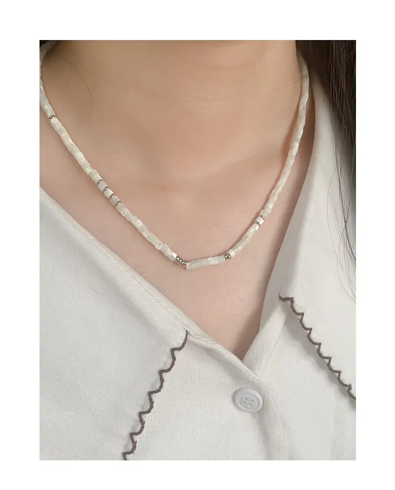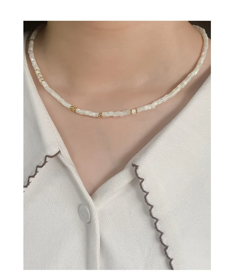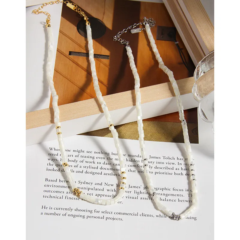 - Color: Features lustrous white, flat-cut shell beads, offering an ethereal shimmer akin to moonlight or mother-of-pearl, reflecting light with a soft glow. These are elegantly contrasted with polished, radiant gold-toned cylindrical beads, adding warmth and luxury.