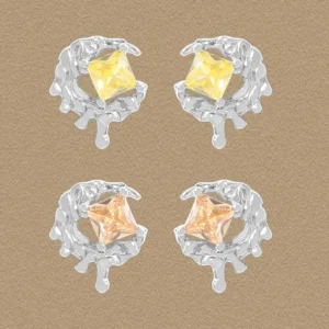 - Color: Crafted in lustrous silver-toned metal, these studs feature vibrant, square-cut gemstones available in radiant yellow and warm peach hues, reminiscent of ethereal light.
