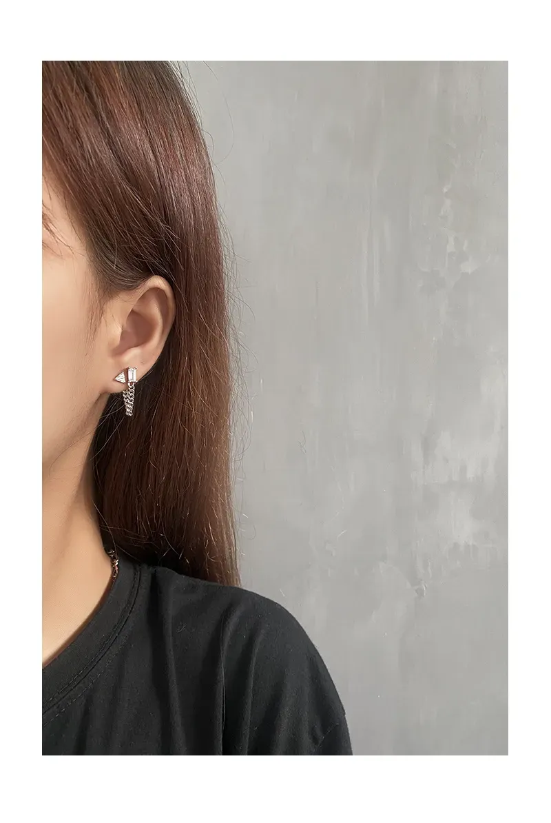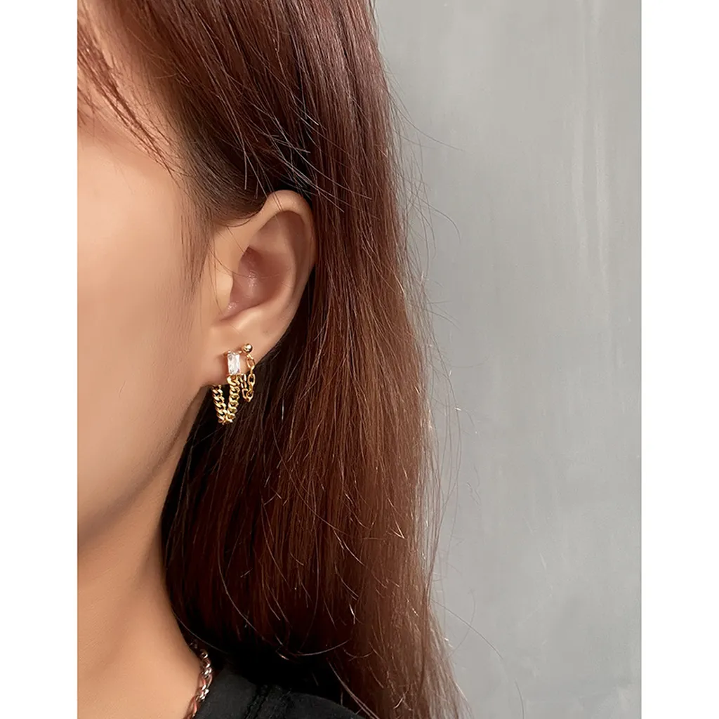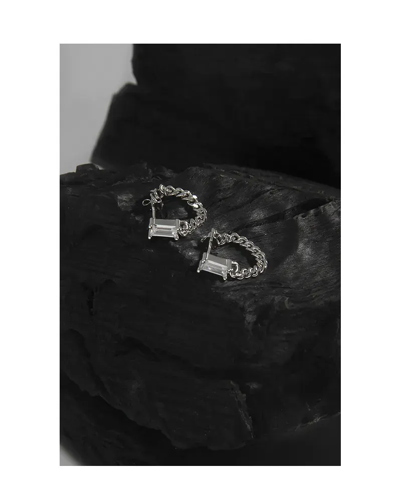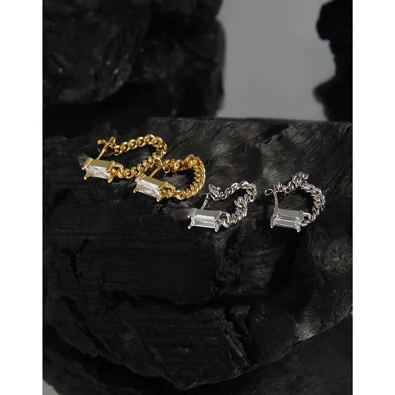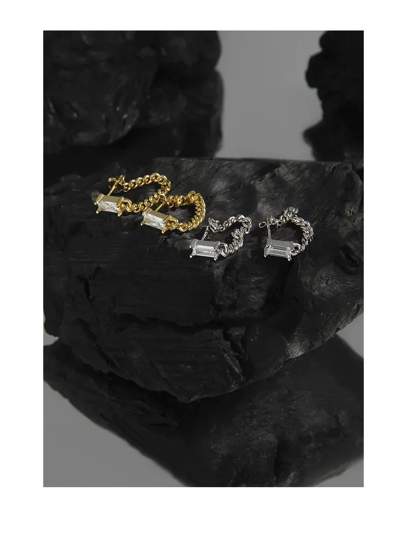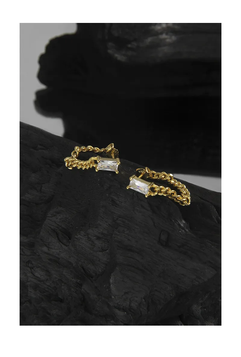 • Style: These contemporary stud Thaloriel Earrings feature a unique design where a gleaming baguette crystal stud anchors a delicate, curving chain. The chain gracefully loops below the earlobe, creating a modern and sophisticated drop effect that embodies fluid movement and understated luxury, reflecting the brand’s commitment to designs as organic as the world around us.