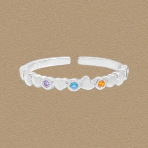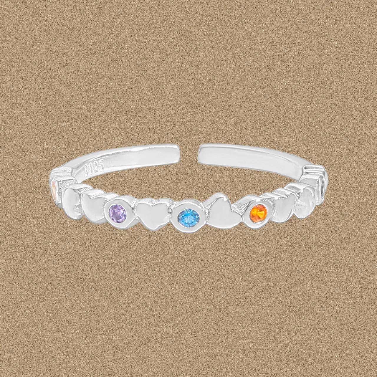 • Patterns or Textures: The band showcases a continuous pattern of elegantly formed, smooth heart shapes. Some of these hearts delicately cradle the sparkling, round-cut gemstones, creating a harmonious blend of solid silver and brilliant color. The highly polished surface of the sterling silver provides a sleek, reflective texture that catches the light beautifully.