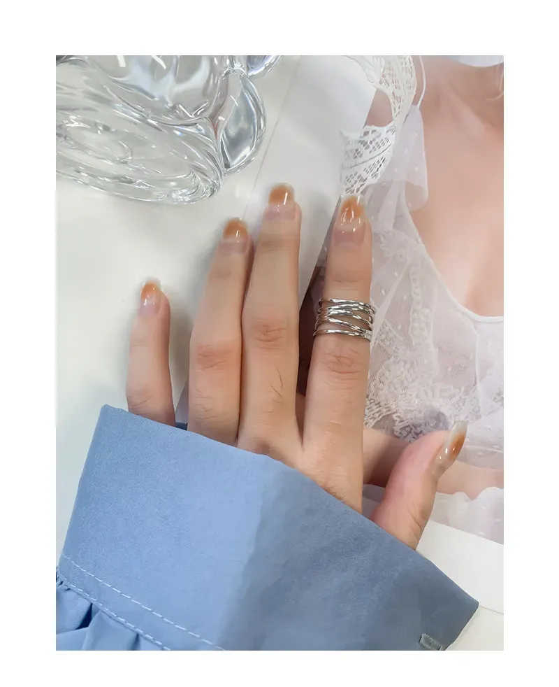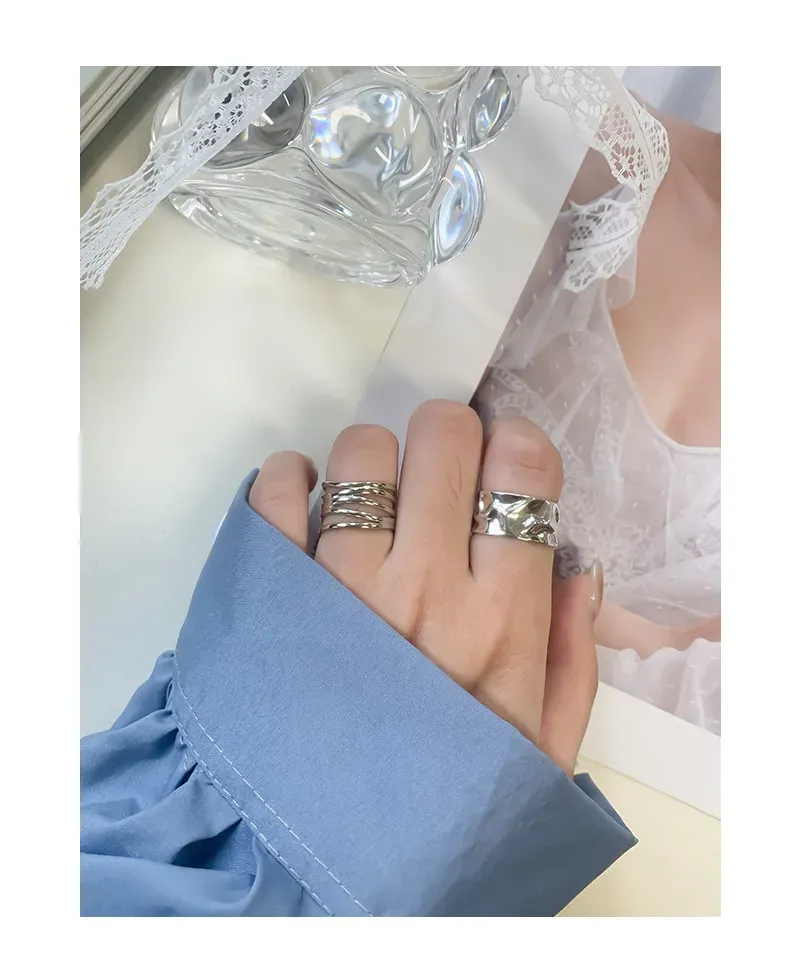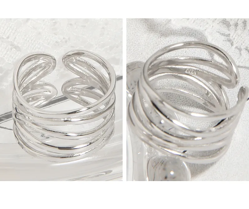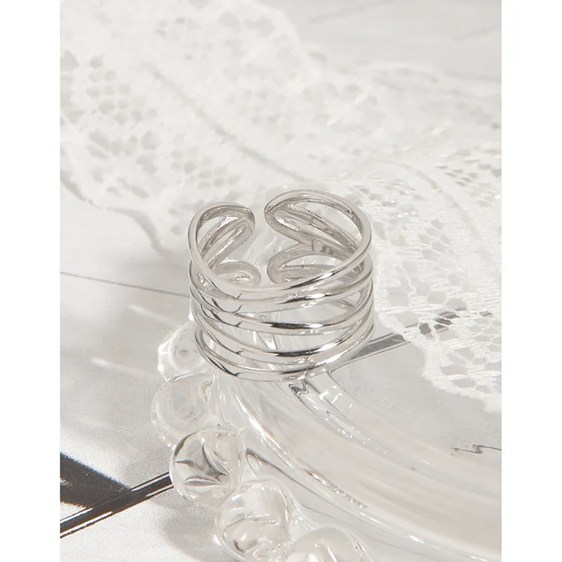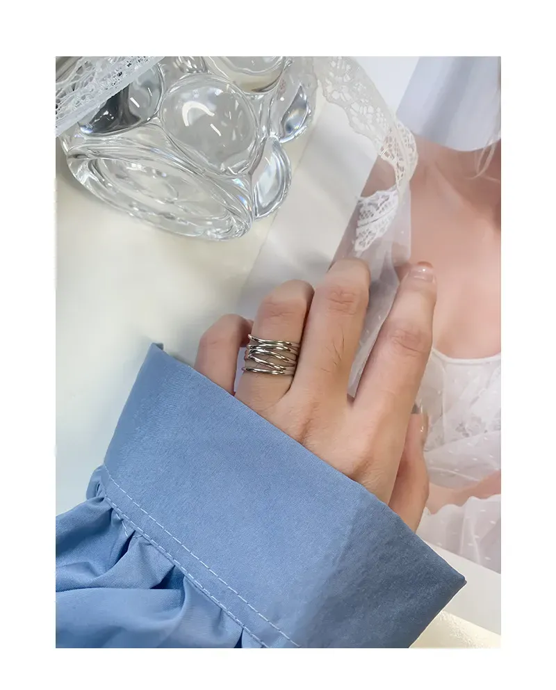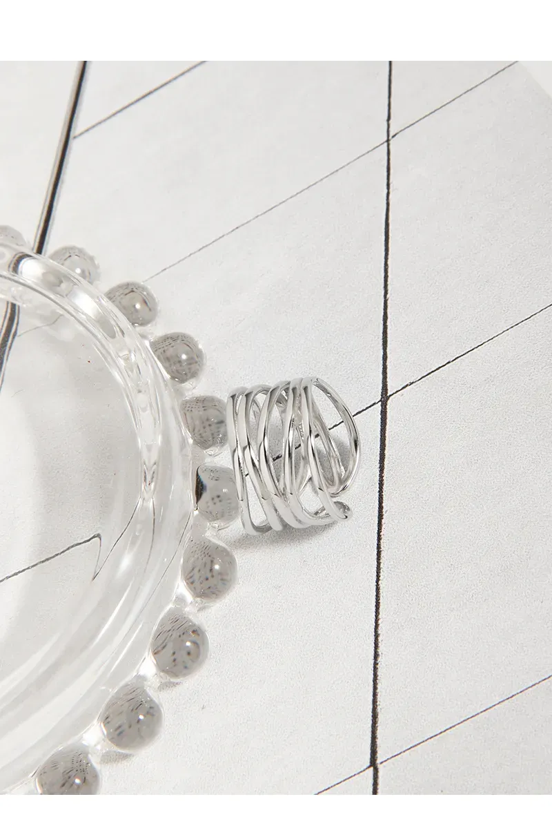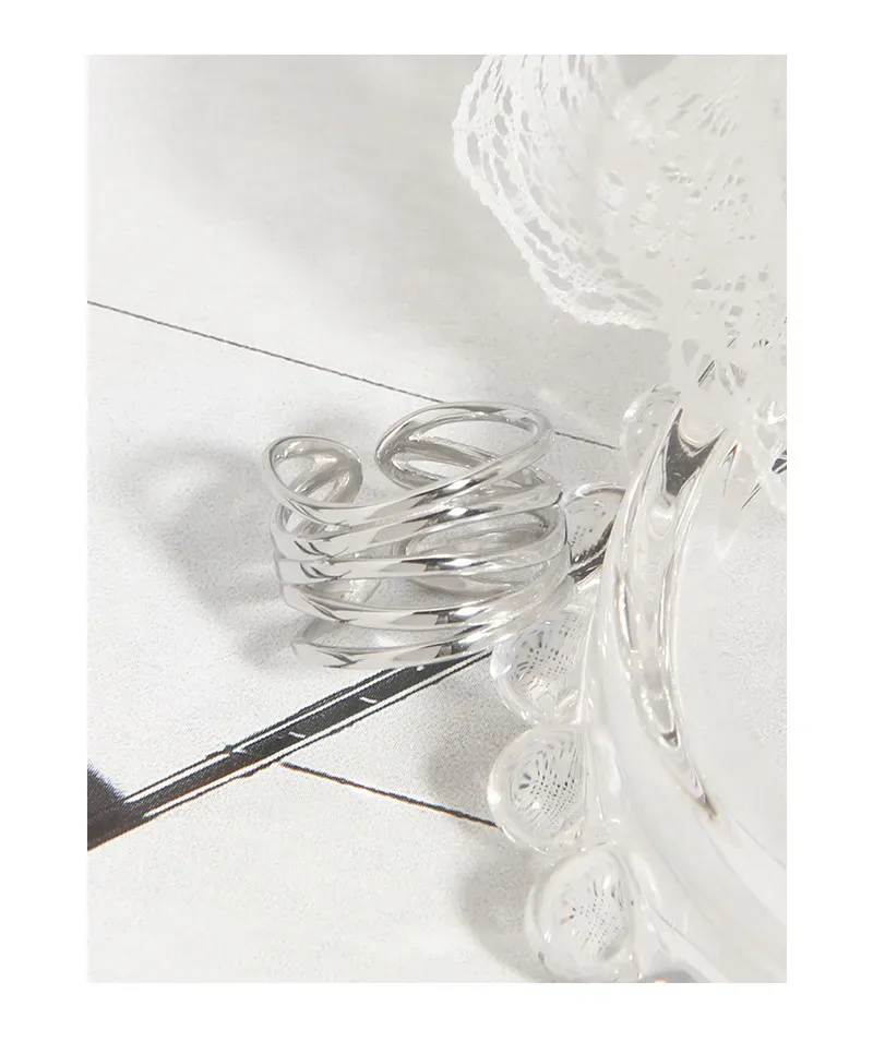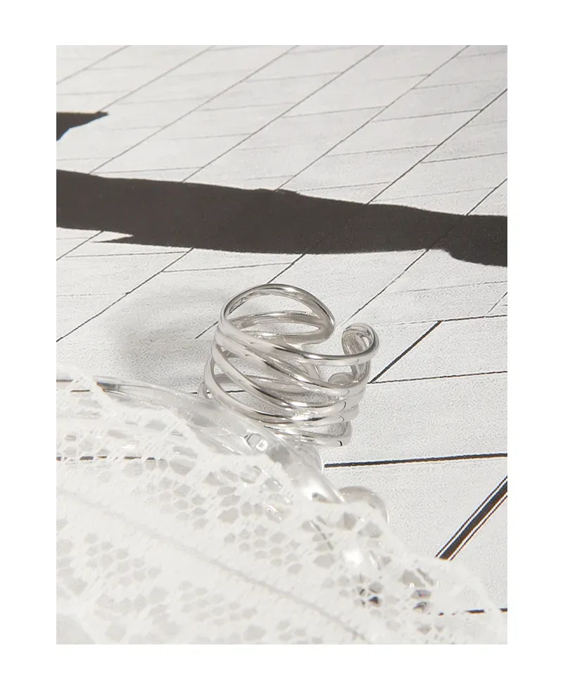 Designed with a contemporary and open cuff style, this ring showcases a striking multi-layered silhouette. Its architectural yet fluid form offers a bold statement, embodying both strength and delicate movement. The adjustable design ensures a comfortable and versatile fit.