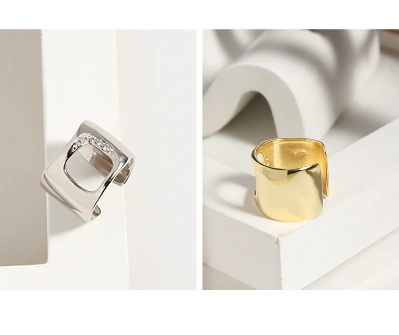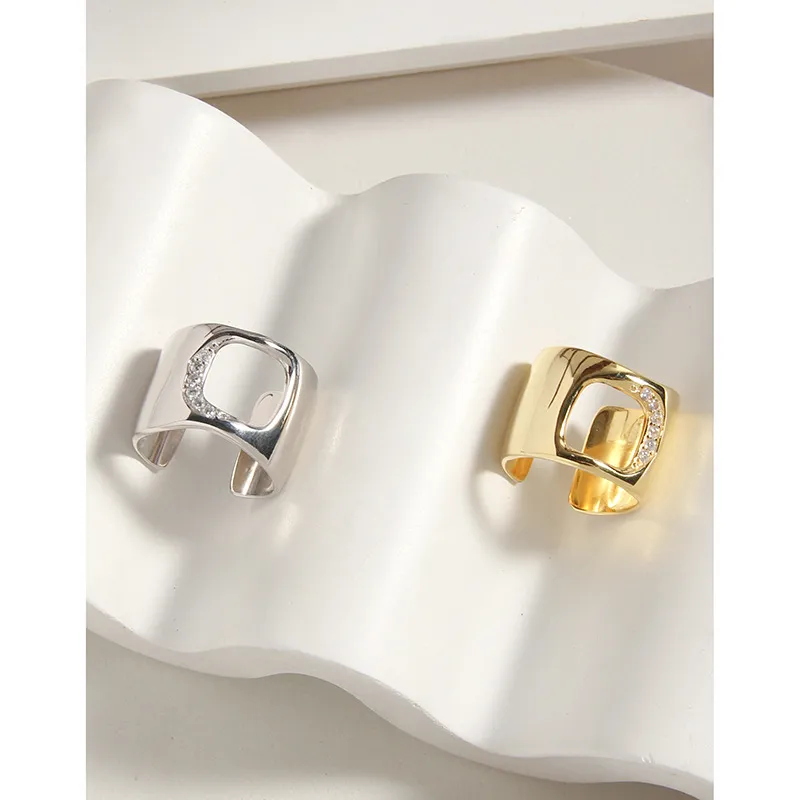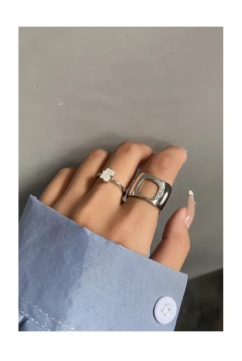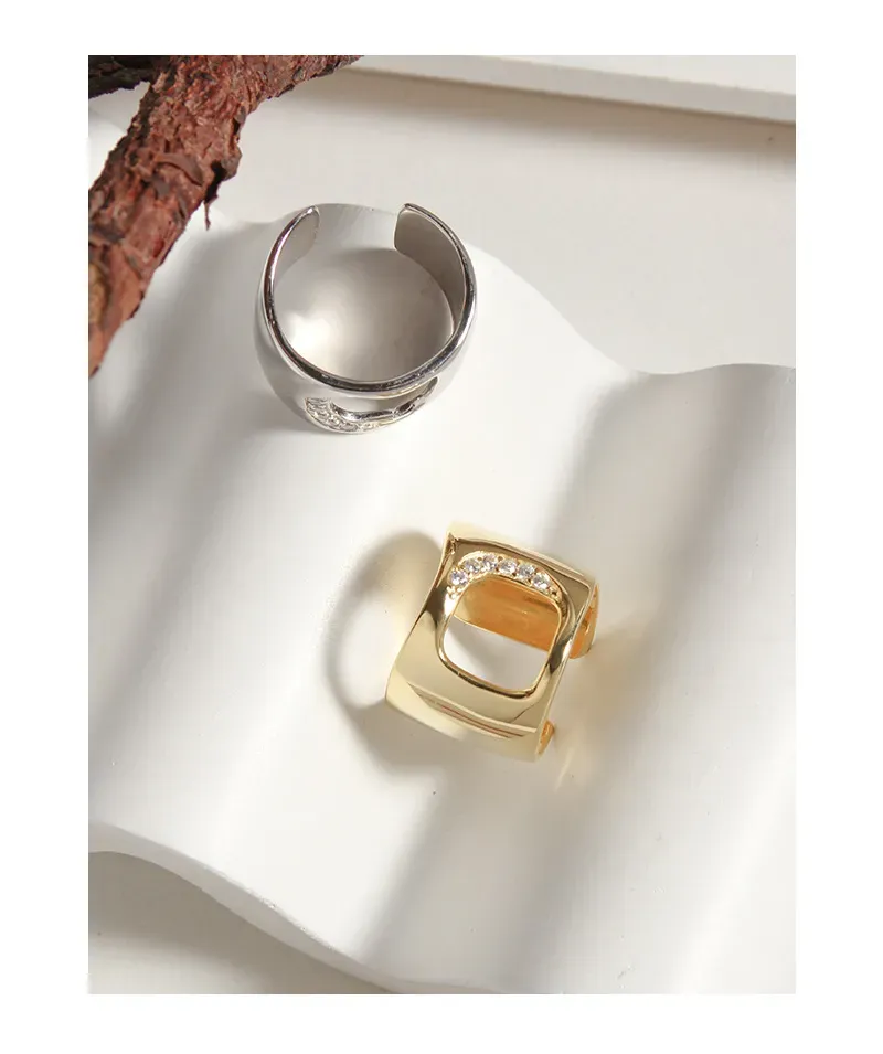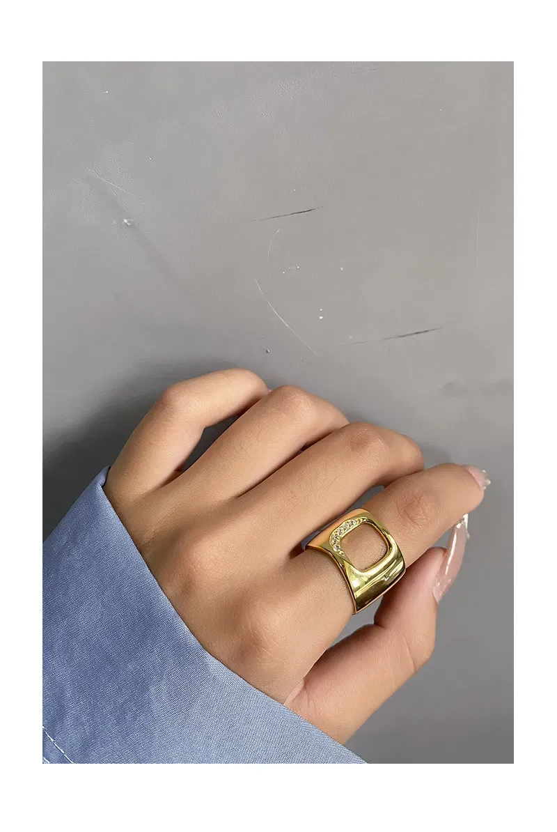 • Patterns & Textures: The ring boasts a smooth, highly polished finish that reflects light with a captivating gleam. An artfully crafted irregular cut-out introduces an element of raw, organic beauty. Along one edge of this unique aperture, a delicate line of brilliant clear stones adds a celestial sparkle, evoking the shimmer of the night sky and the magical glow of the aurora borealis.