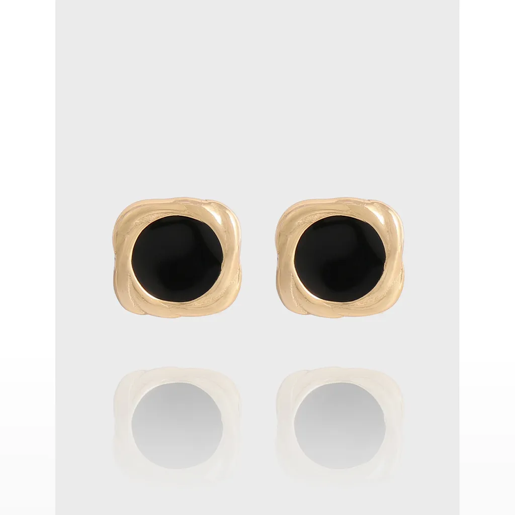 Embrace the enchanting allure of Malisse with these exquisite stud earrings, a testament to nature’s fluid beauty. Each earring features a captivating deep black circular center, reminiscent of celestial depths, elegantly framed by a lustrous gold border.