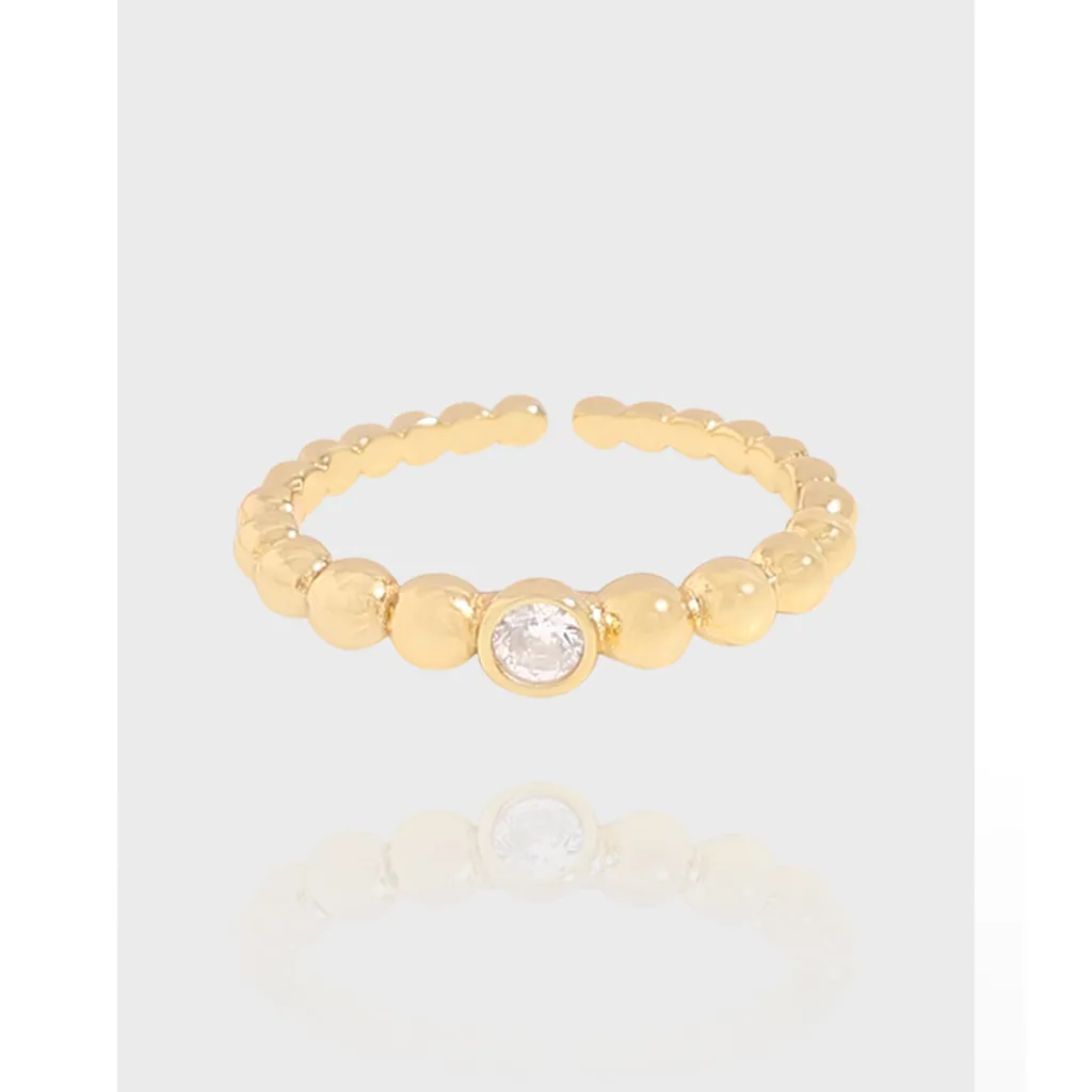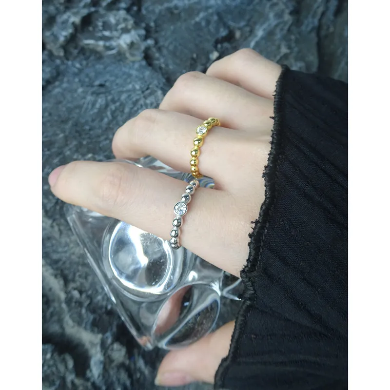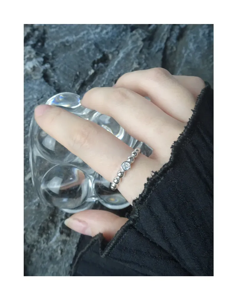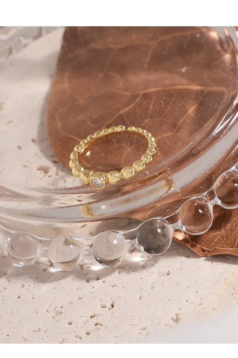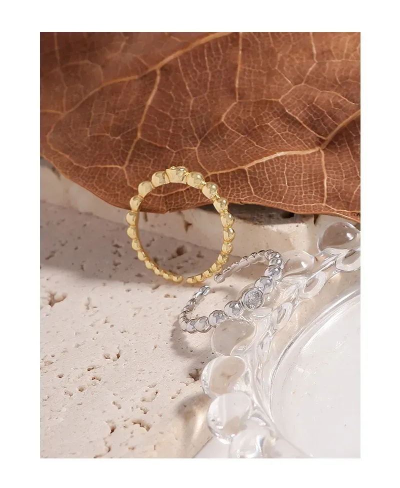 • Patterns & Textures: The band is adorned with a continuous series of smooth, rounded beads, creating a tactile and organic texture that beautifully complements the central, bezel-set clear stone. This design reflects the imperfect beauty and raw textures inspired by natural elements.