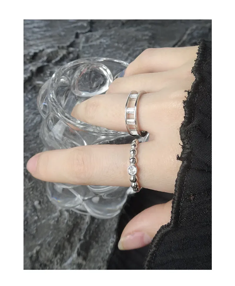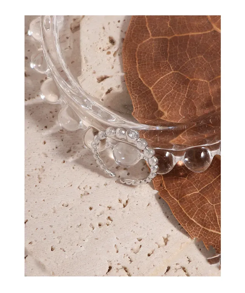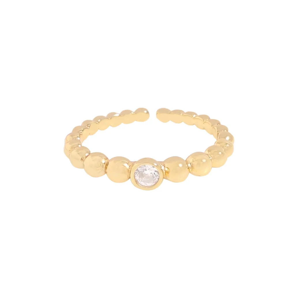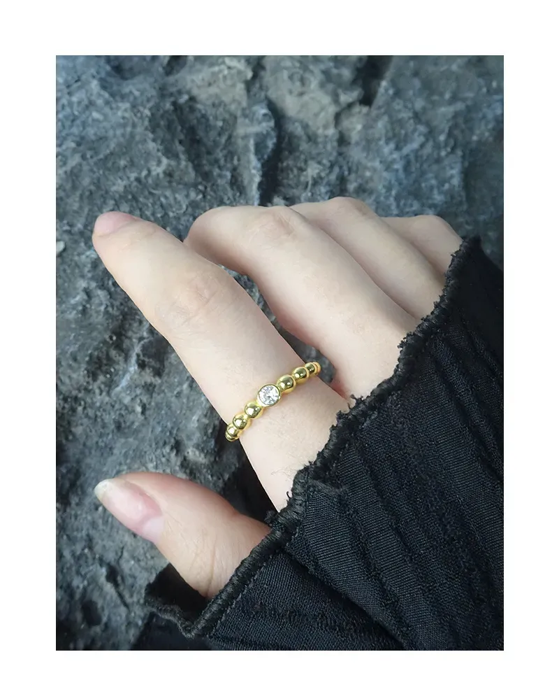 • Patterns & Textures: The band is adorned with a continuous series of smooth, rounded beads, creating a tactile and organic texture that beautifully complements the central, bezel-set clear stone. This design reflects the imperfect beauty and raw textures inspired by natural elements.