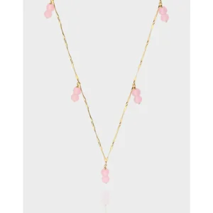 - Patterns & Textures: The slender gold chain boasts a unique twisted texture, designed to shimmer and reflect light with every movement, reminiscent of an “ever-changing brilliance.” Smooth, perfectly round pink beads are grouped in pairs, creating a delicate, berry-like pattern that enhances the piece’s natural charm.