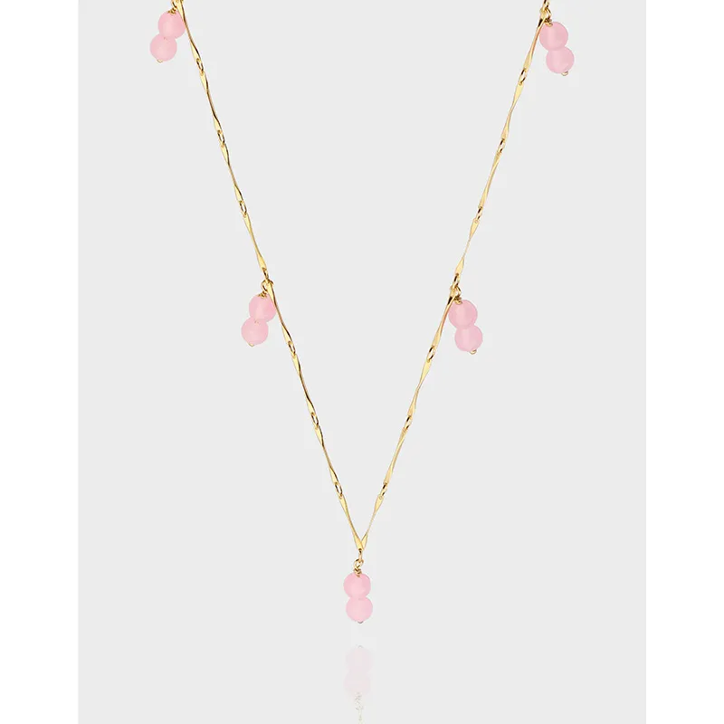 - Color: Features translucent, delicate pink beads that exude a soft, ethereal glow, perfectly complemented by the warm, radiant hue of the gold chain.