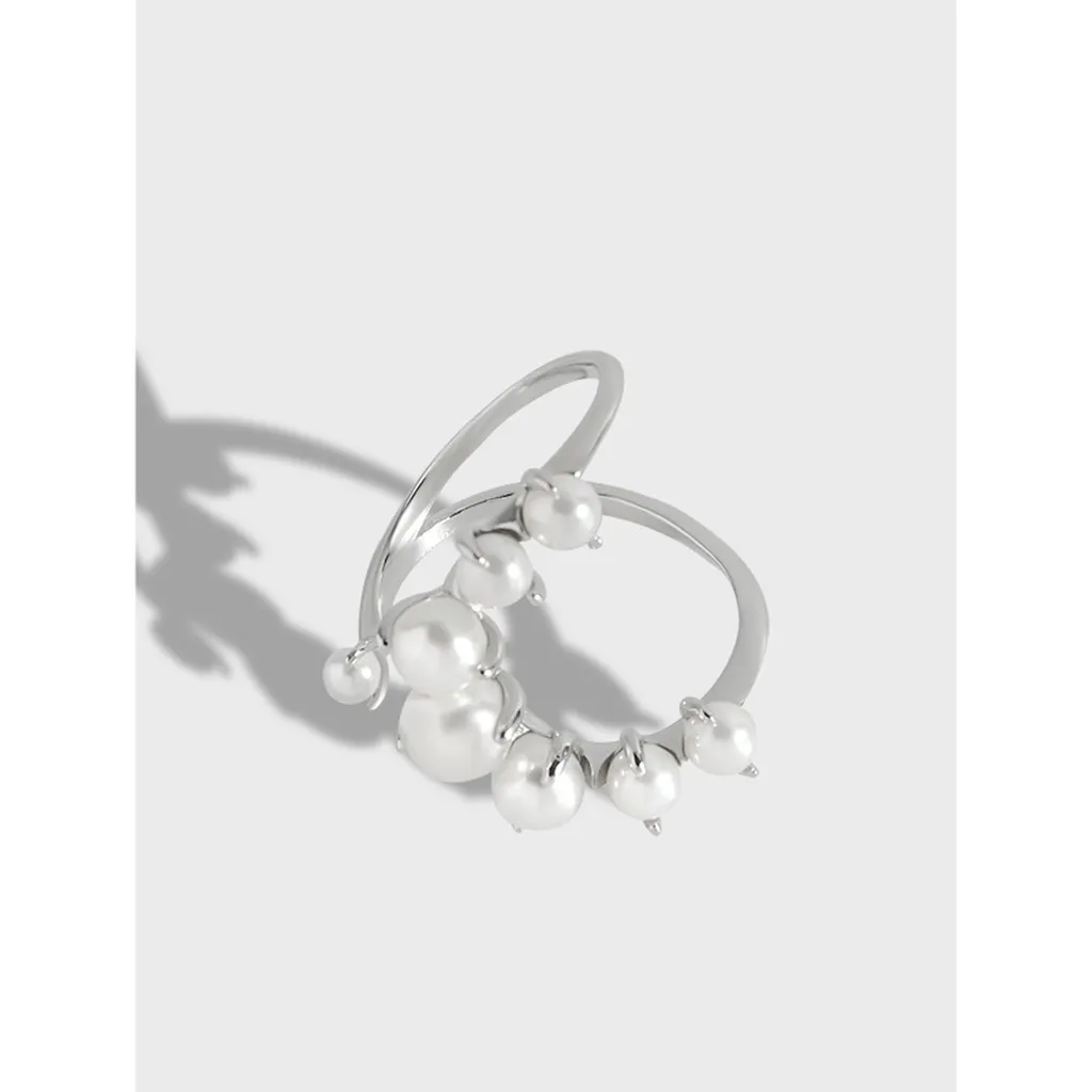 Adorning the organic curves are luminous white pearls of varying sizes, meticulously arranged in a dynamic cluster. Each pearl boasts a smooth, iridescent texture, reflecting light with a soft glow, reminiscent of moonlit dewdrops or distant stars. The polished silver surface provides a striking contrast, enhancing the pearls’ delicate allure and creating a modern, artful statement piece.