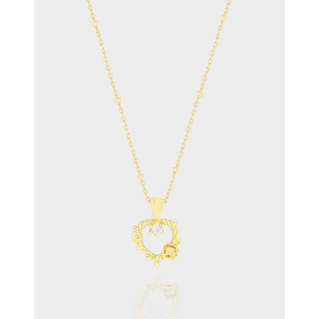 Patterns & Textures: The slender chain boasts a unique beaded texture, creating a subtle, organic rhythm. The pendant showcases an intricate openwork pattern, reminiscent of intertwining vines or branches, forming a beautifully sculpted heart. A delicately rendered rose bloom graces one side, enhancing its natural motif. The gold surfaces exhibit a refined, slightly textured finish, echoing the raw beauty and fluid shapes found in nature, while a sparkling, round-cut stone captures and reflects light brilliantly at its center.