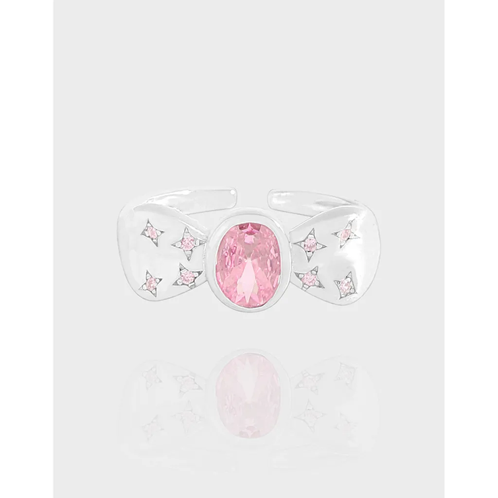 • Patterns & Textures: The smooth, polished silver band provides a sleek foundation, contrasting beautifully with the sparkling facets of the central pink gemstone. On either side, intricate starburst outlines are etched into the silver, each cradling a smaller, round pink gemstone, adding a delicate pattern and subtle texture that evokes a starry firmament.