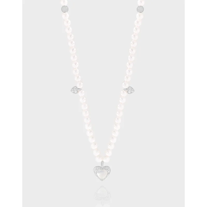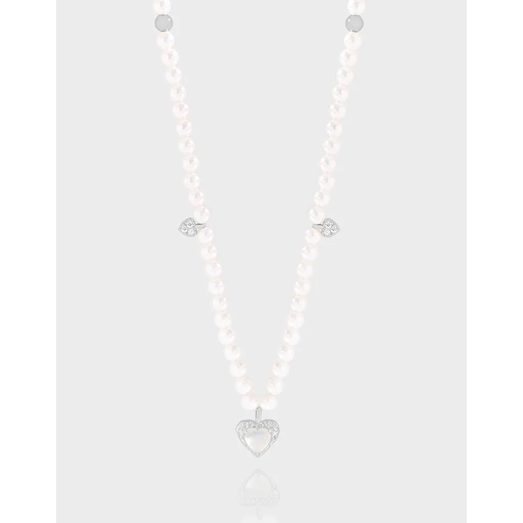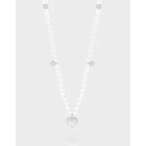 - Color: Pristine white pearls form the main strand, beautifully contrasted by brilliant silver-toned metal accents. The focal point is an enchanting heart pendant with an iridescent, opalescent shimmer, reminiscent of celestial light.