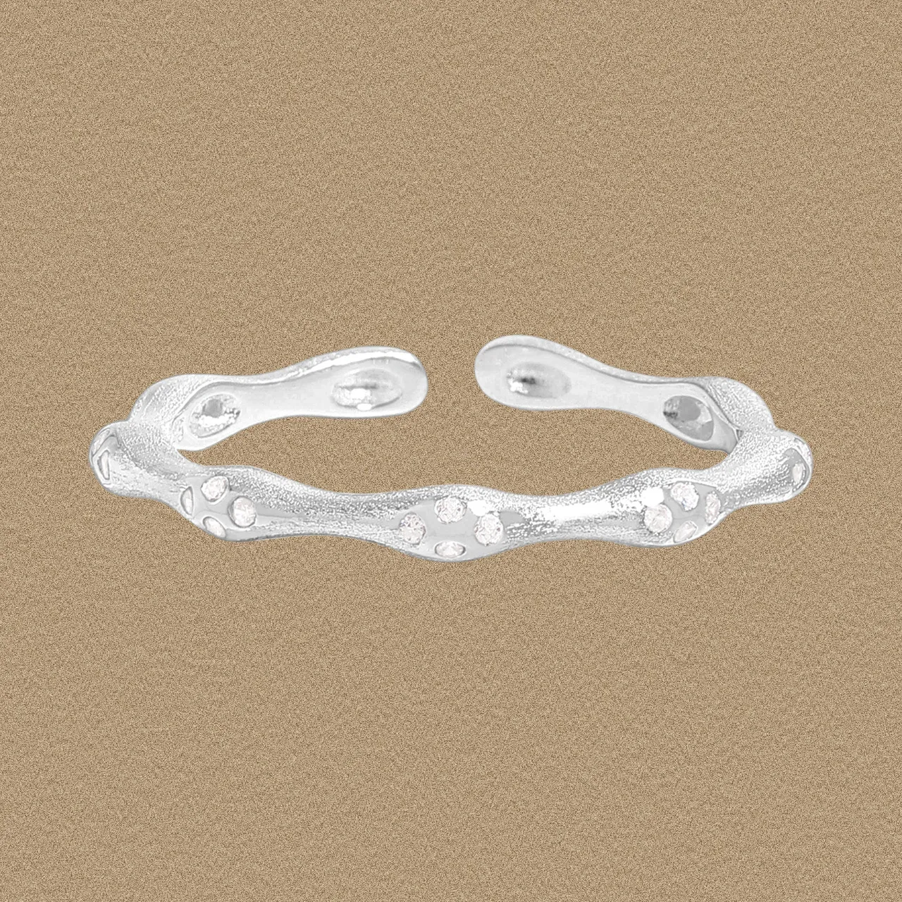 Patterns & Textures: The band showcases a beautifully raw and subtle granular texture across its silver surface, providing depth and a tactile connection to nature’s imperfect beauty. This organic backdrop is elegantly contrasted by smooth, polished settings that cradle multiple irregularly spaced clear stones, each sparkling like a fragment of the night sky, creating a celestial pattern along the wavy form.