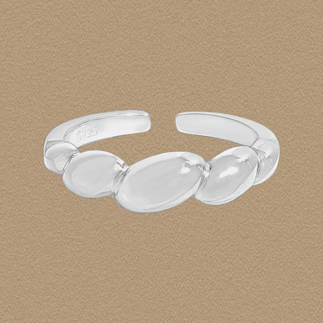 Inspired by nature’s gentle contours, this adjustable ring features a lustrous, polished silver finish. Crafted from S925 Sterling Silver, its unique design showcases a series of smoothly rounded, elongated segments that gracefully intertwine. This creates an organic, fluid pattern that reflects light with every movement.