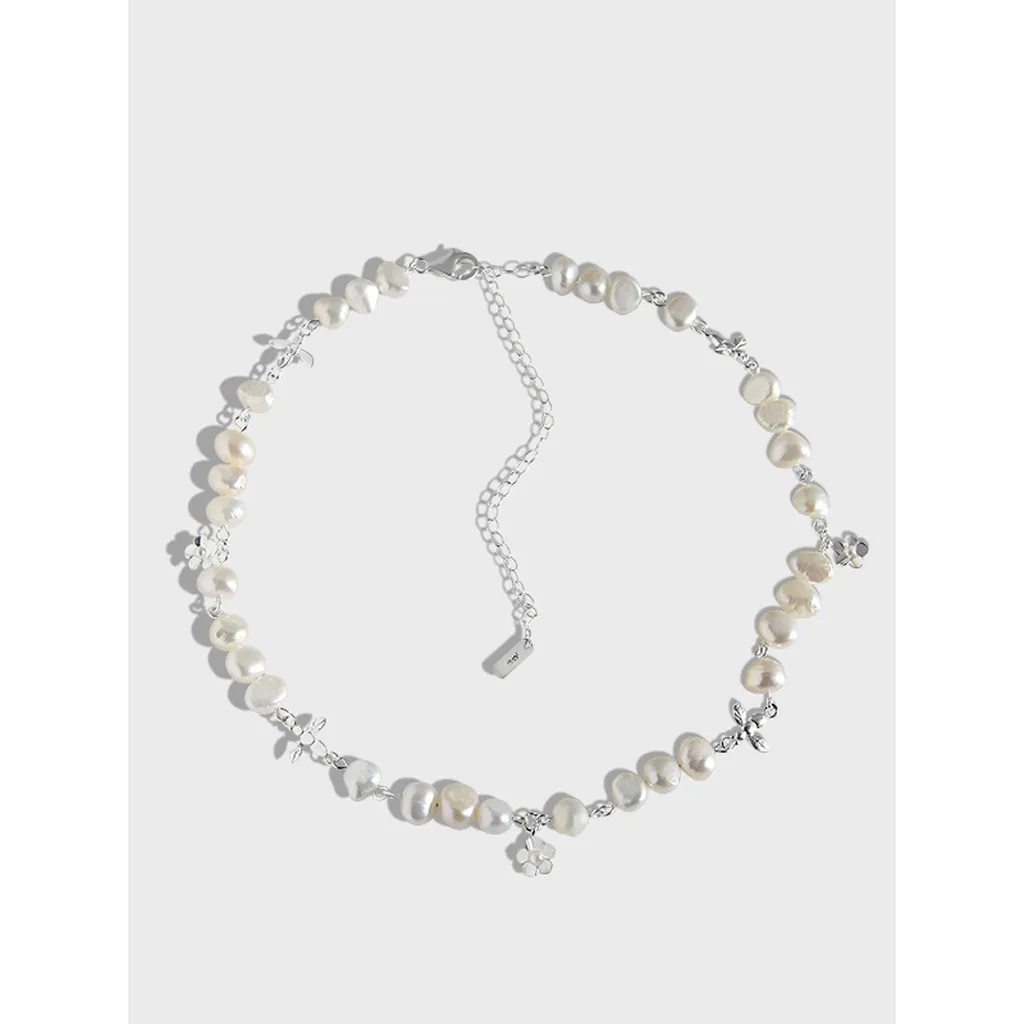Patterns & Textures: The centerpiece is a series of irregular, genuine baroque pearls, each unique in its raw texture and fluid shape, mirroring the imperfect beauty of nature. These are interspersed with smooth, polished sterling silver links and adorned with charming, delicate flower or starburst-shaped charms, adding a subtle pattern and celestial sparkle.