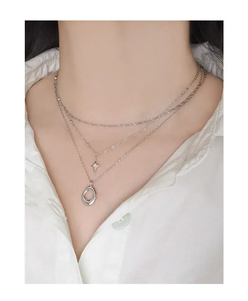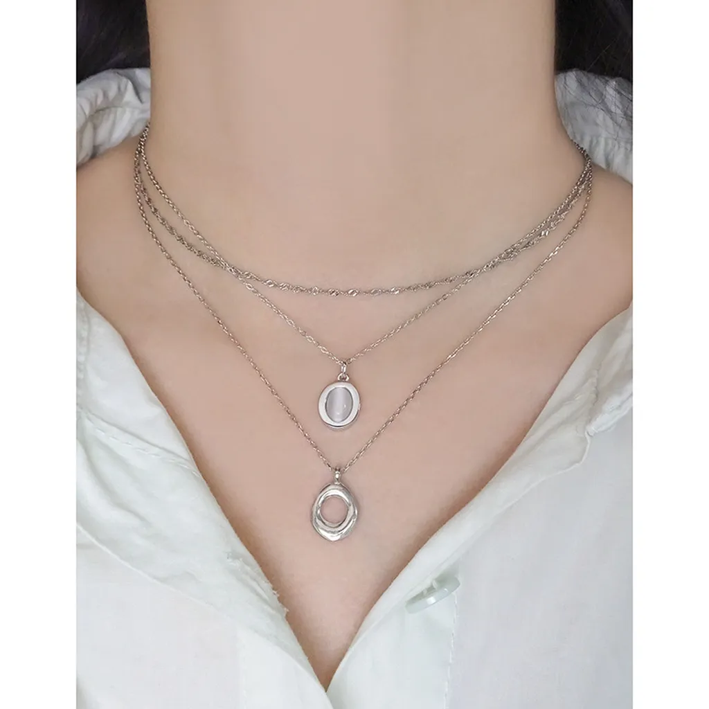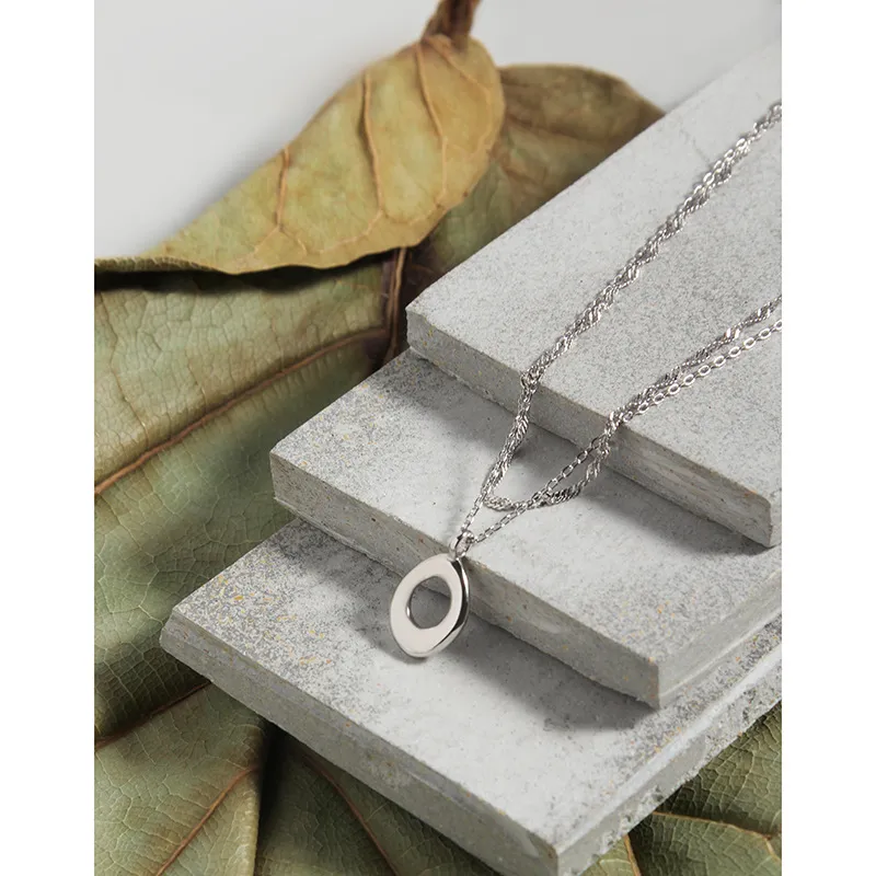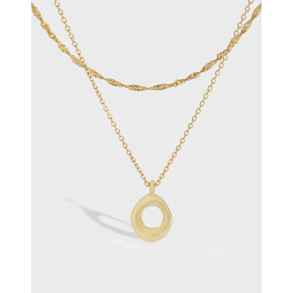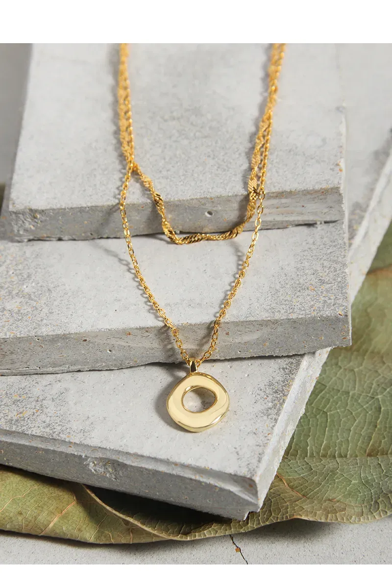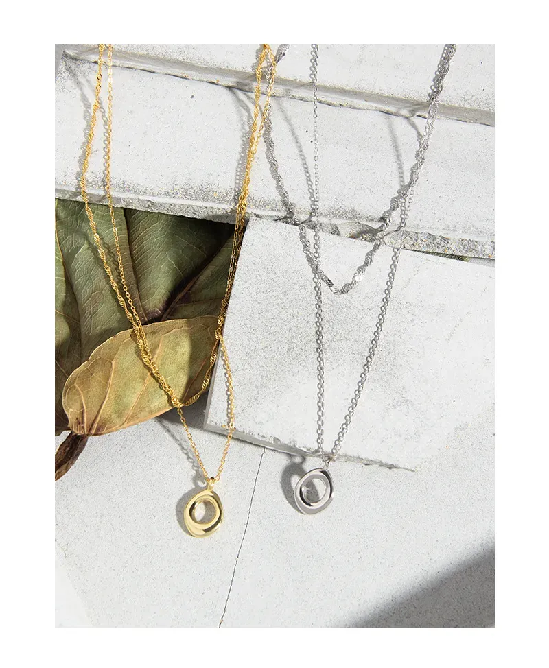 • Patterns & Textures: The centerpiece is an artfully crafted pendant with an organic, open oval shape, reminiscent of fluid natural forms. Its surface subtly hints at raw, earthy textures, celebrating the imperfect beauty found in nature’s artistry. Each chain adds its own unique pattern, from the intricate twists of the upper chain to the smooth links of the lower, embodying the diverse textures of the natural world.