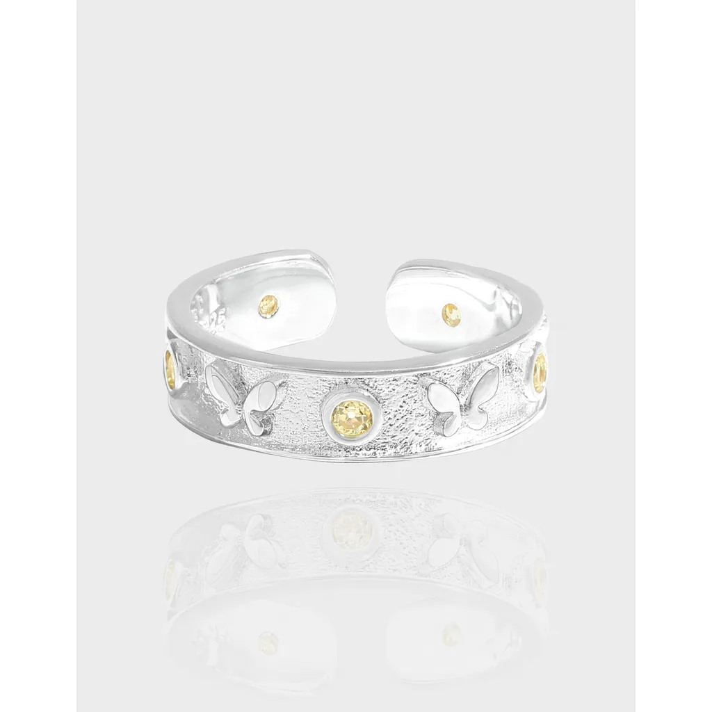 The Velithra Ring’s design features a delicate balance of textures: the band showcases an authentic, slightly raw finish, reminiscent of earth’s own patterns. Gracefully dancing across this textured landscape are polished butterfly motifs, their fluid shapes bringing a touch of whimsical elegance. Each butterfly is accompanied by a brilliant, bezel-set yellow gemstone, reflecting a celestial sparkle that evokes the depth of natural elements and the shimmer of light.