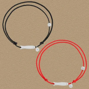 - Patterns & Textures: Crafted with a finely braided cord that offers a subtle, tactile texture, this bracelet is adorned with a sleek, silver-tone fish charm. The charm boasts a smooth, polished surface and a gracefully stylized, fluid shape, reminiscent of a sardine’s elegant form. Two lustrous spherical beads, also polished to a reflective shine, accent the design, adding a touch of celestial shimmer.
