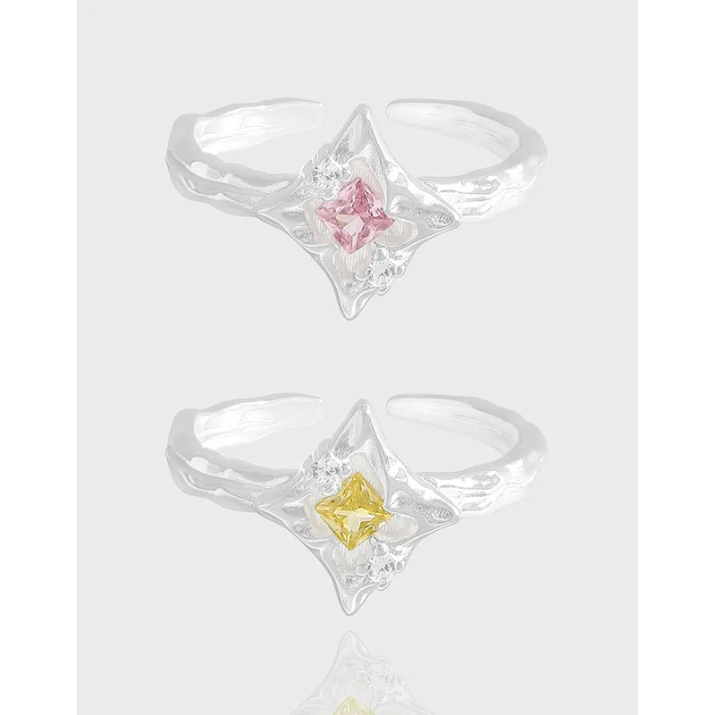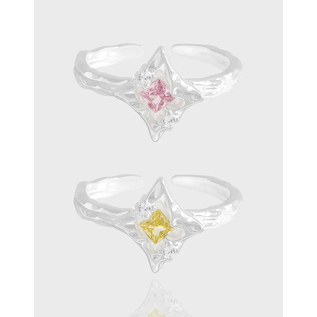 Crafted in a radiant silver-toned metal, this Venarielle Ring showcases a striking square-cut gemstone as its centerpiece. Choose between a captivating blush pink, reminiscent of dawn’s first light, or a luminous sunshine yellow, embodying a vibrant burst of energy. These central gems are gracefully complemented by smaller, sparkling clear accent stones that enhance its celestial glow.