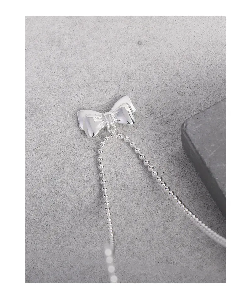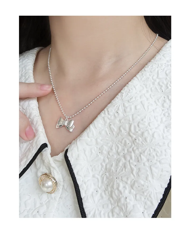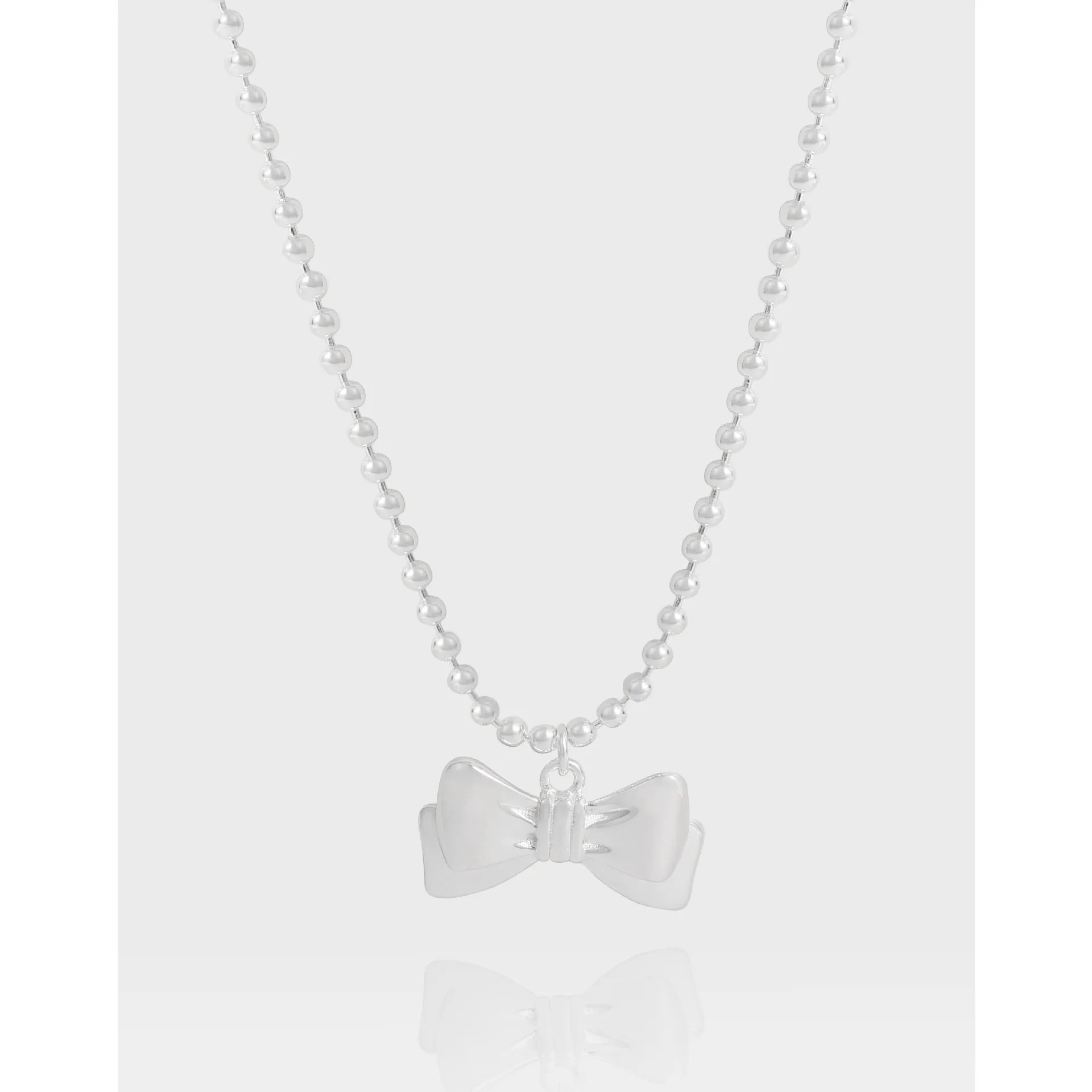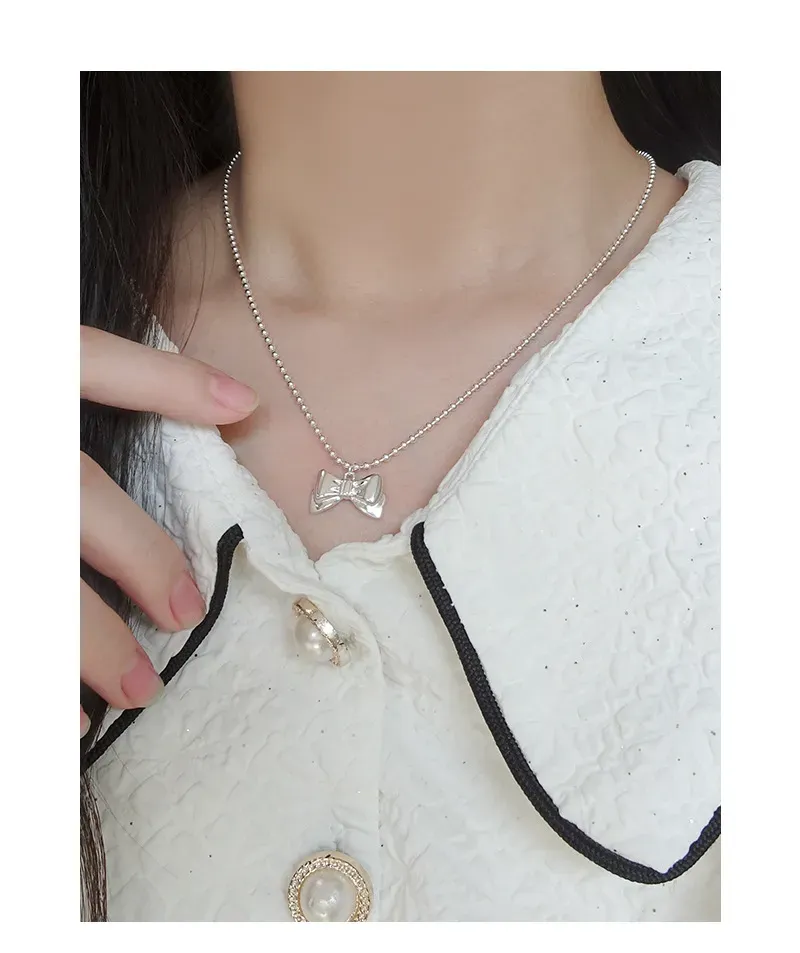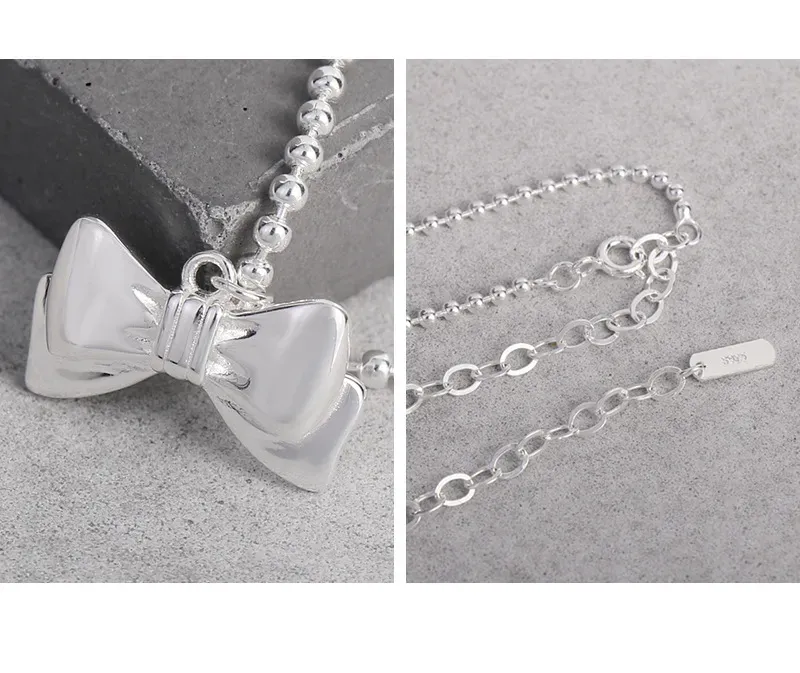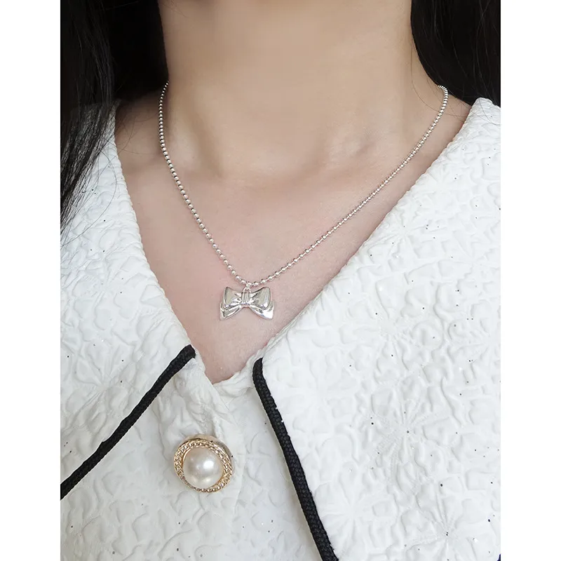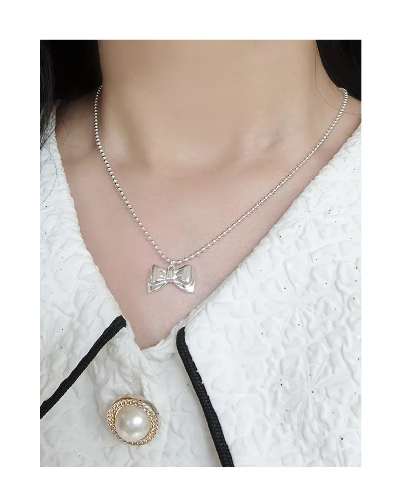 - Patterns & Textures: The bow pendant features a smooth, highly polished surface, creating brilliant reflections and a lustrous finish. The chain is composed of uniformly spherical beads, providing a delicate, tactile texture that complements the pendant’s sleek design.