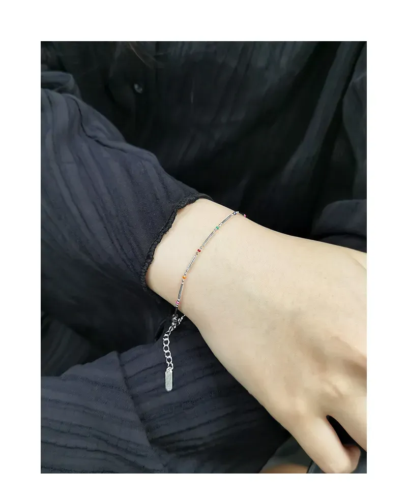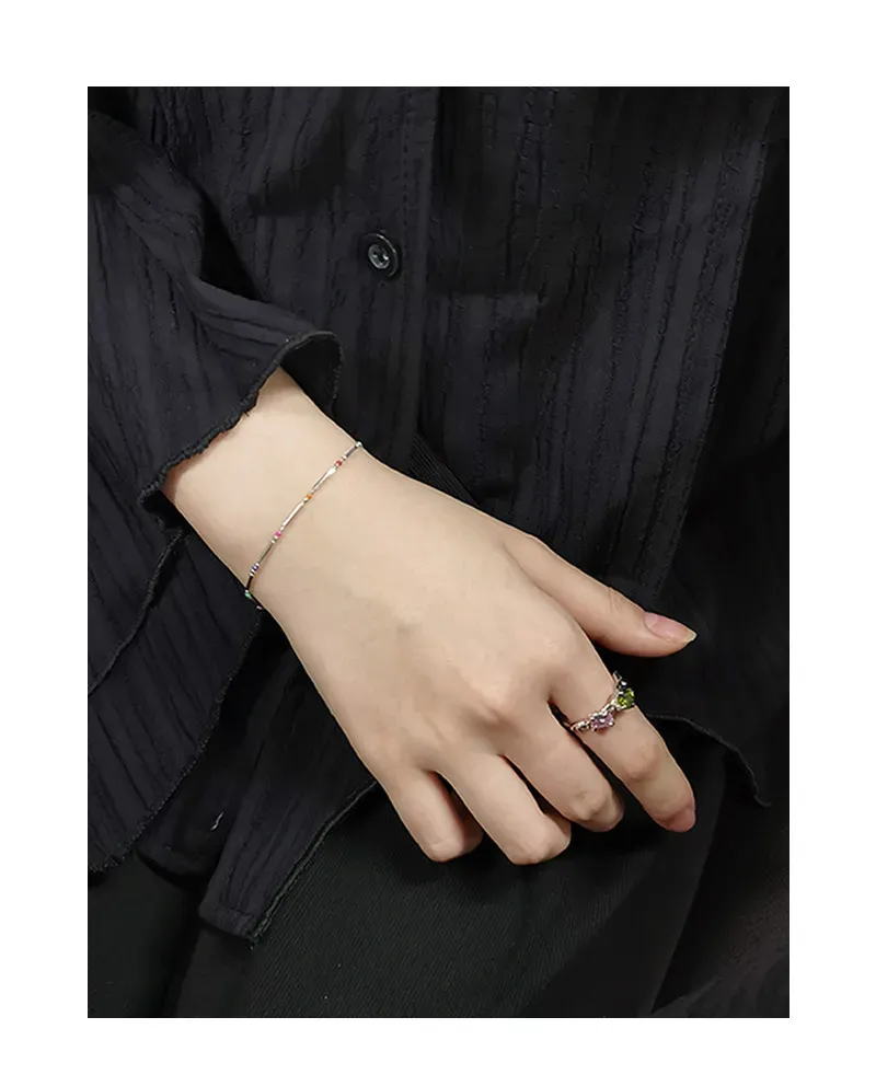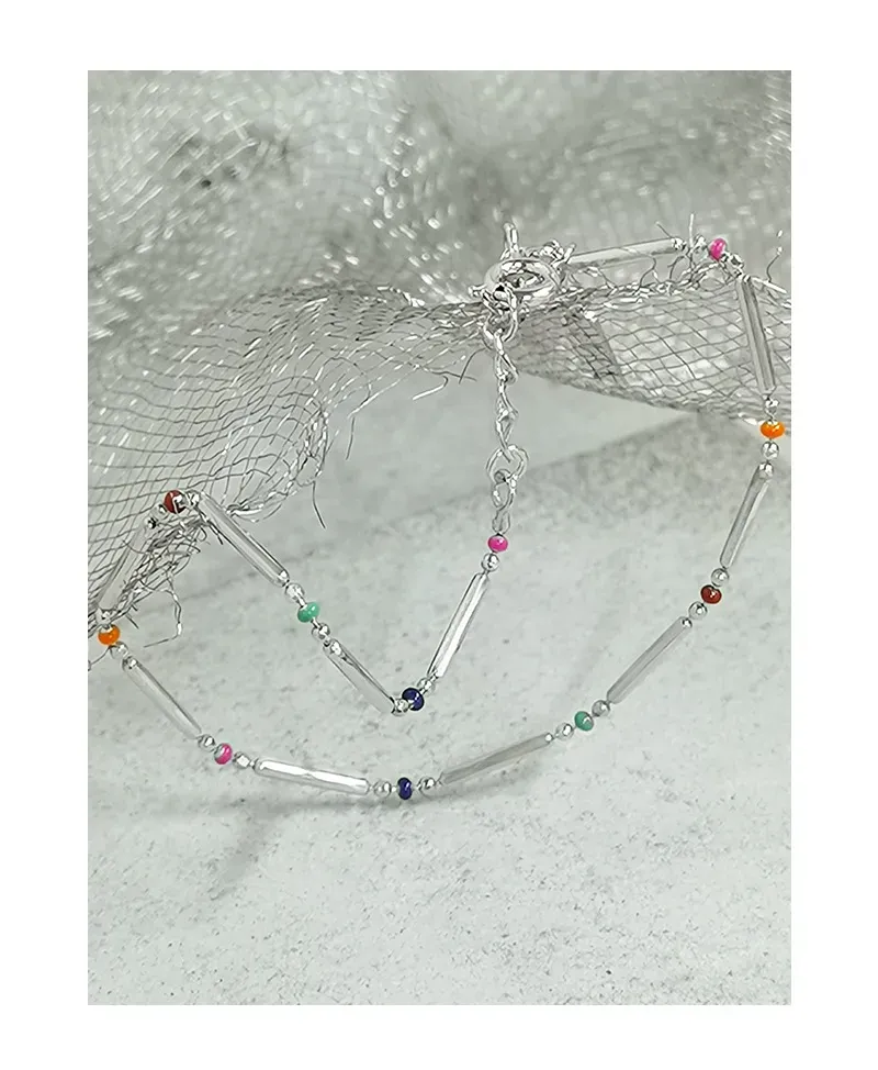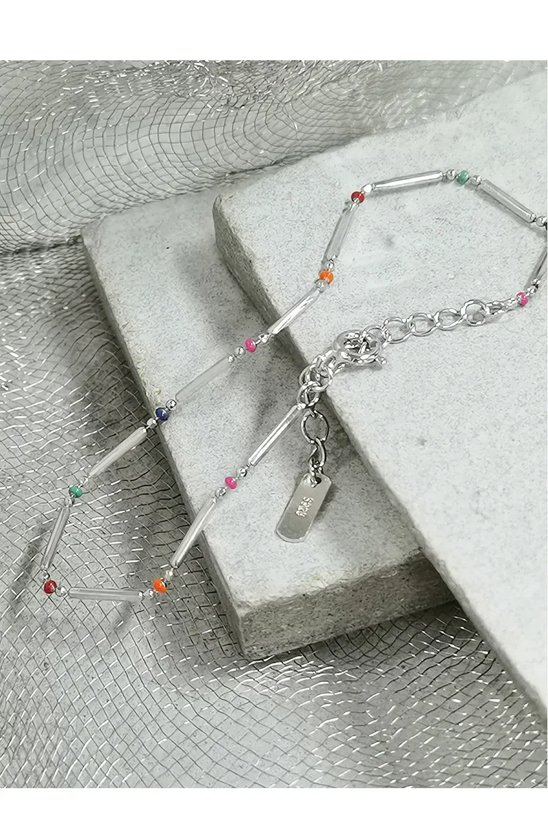 Embrace the enchanting dance of light with this delicate sterling silver bracelet, echoing Malisse’s reverence for nature’s magic. It features a sequence of polished silver bar links, their smooth, reflective surface capturing and diffusing light like a celestial shimmer. Interspersed between these elegant bars are small, vibrant round beads, showcasing a captivating spectrum of colors including fuchsia, dark blue, green, red, orange, and light blue. Each bead represents a unique celestial hue, adding a playful yet sophisticated touch reminiscent of the diverse beauty found in gemstones and the aurora borealis.