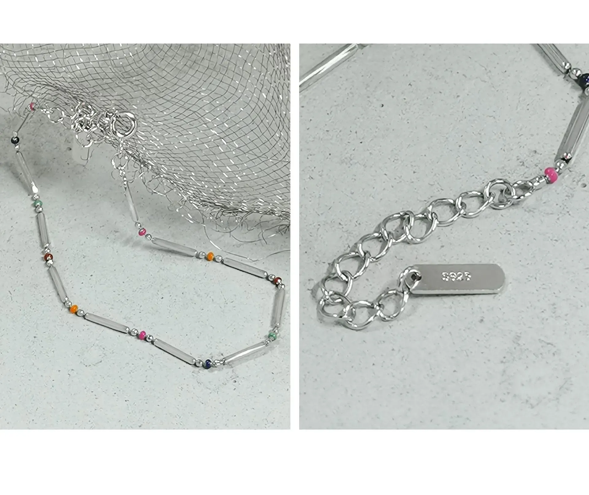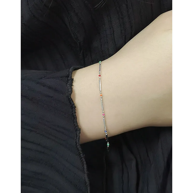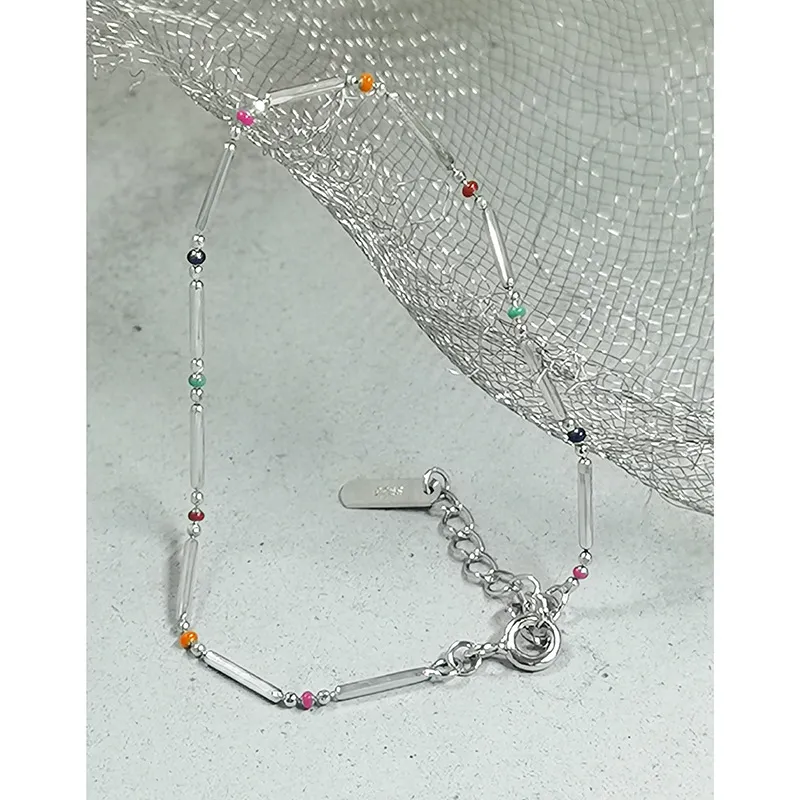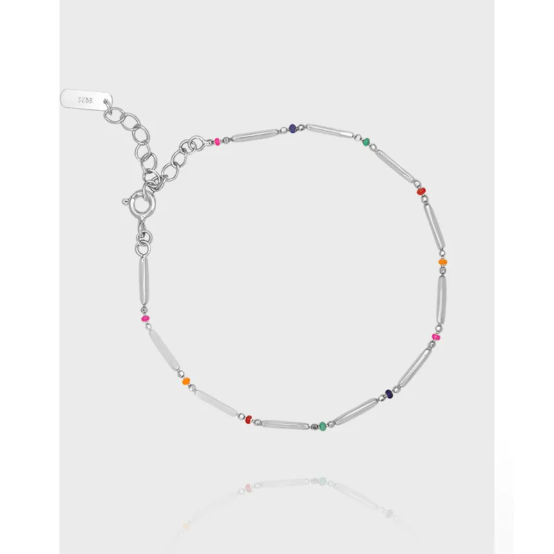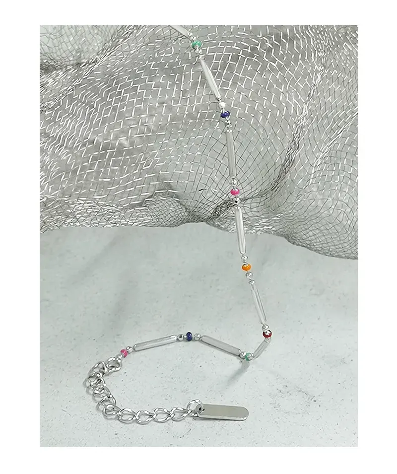 Embrace the enchanting dance of light with this delicate sterling silver bracelet, echoing Malisse’s reverence for nature’s magic. It features a sequence of polished silver bar links, their smooth, reflective surface capturing and diffusing light like a celestial shimmer. Interspersed between these elegant bars are small, vibrant round beads, showcasing a captivating spectrum of colors including fuchsia, dark blue, green, red, orange, and light blue. Each bead represents a unique celestial hue, adding a playful yet sophisticated touch reminiscent of the diverse beauty found in gemstones and the aurora borealis.