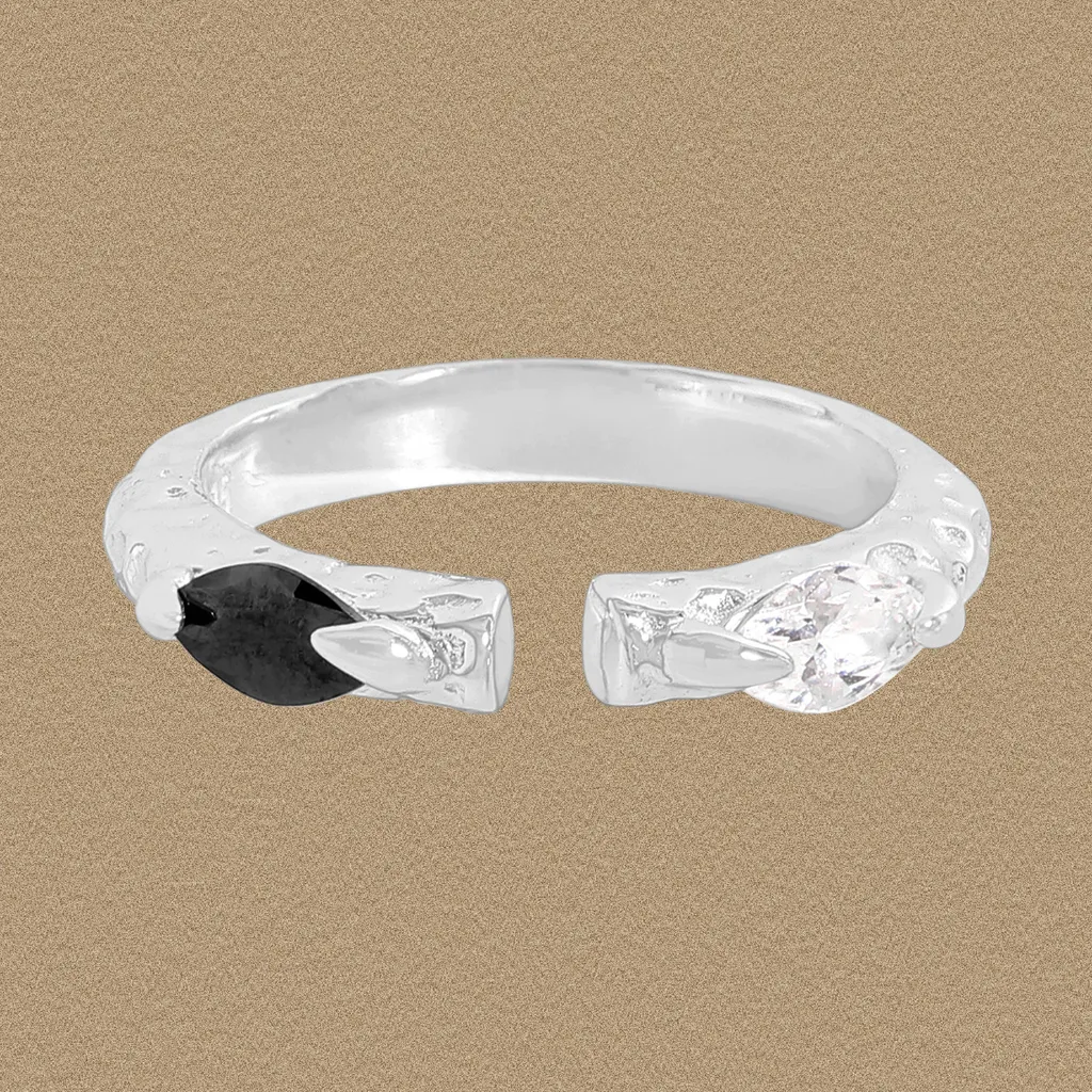 Color: Crafted in lustrous silver-toned metal, the ring showcases a captivating contrast. It features one deep black marquise-cut gemstone evoking the mystery of the night sky, paired with one brilliant clear marquise-cut gemstone, symbolizing the luminous glow of celestial light.