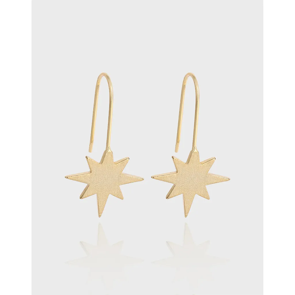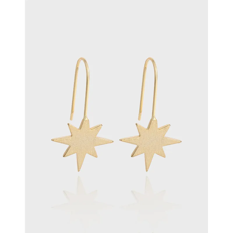 These elegant dangle earrings feature a radiant gold tone, capturing the essence of celestial beauty. Each earring showcases a delicate, eight-pointed star, reflecting the allure of the night sky.