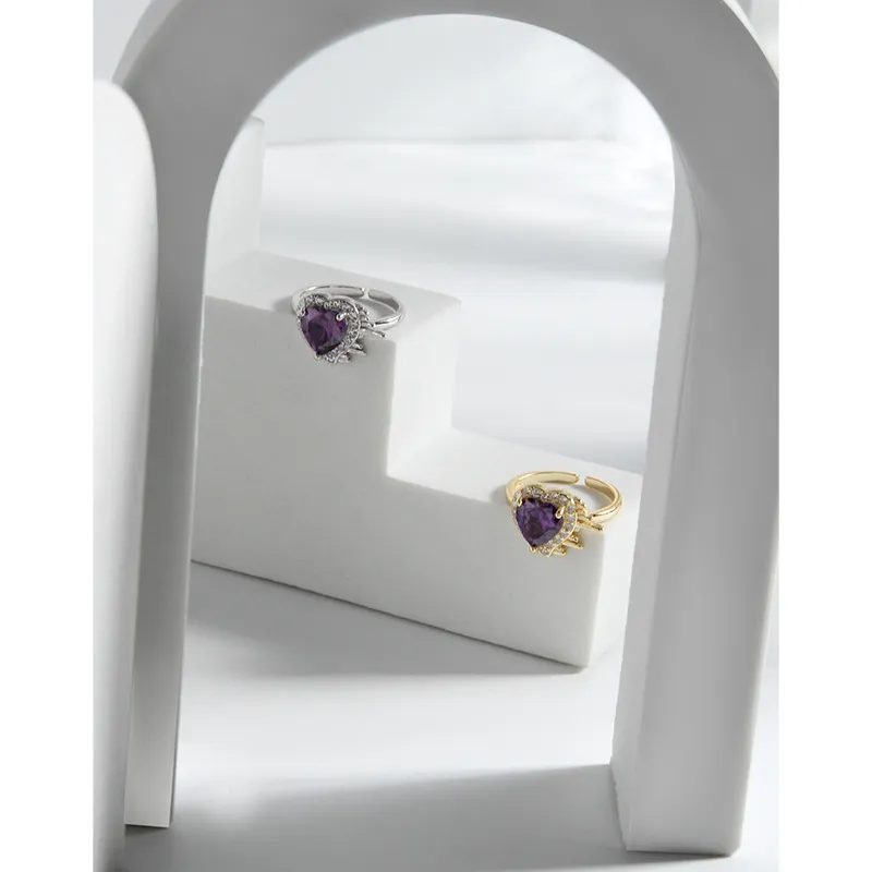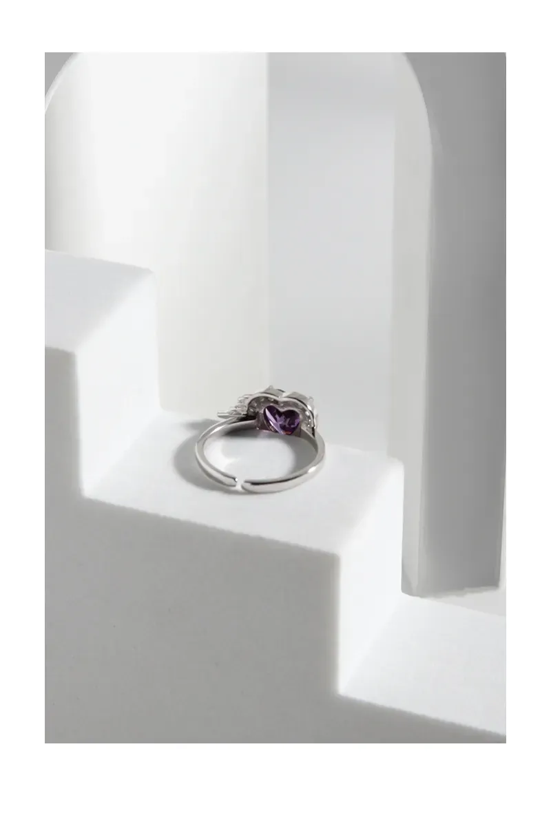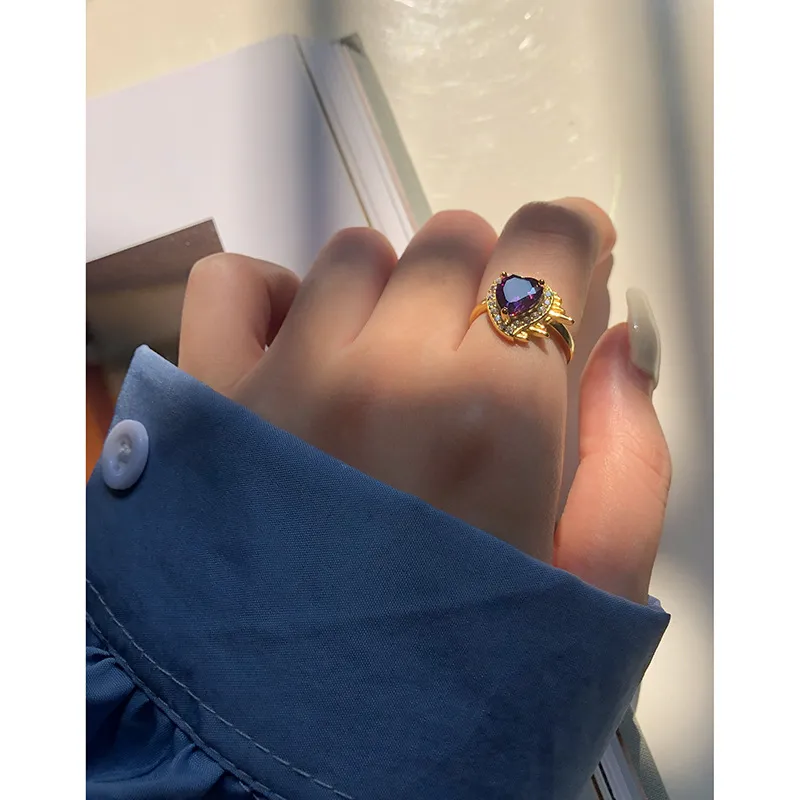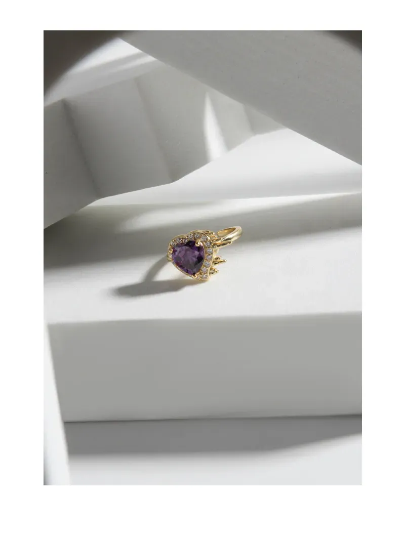 • Patterns or Textures: The focal point is a smoothly faceted, heart-cut purple gemstone, encircled by a brilliant halo of smaller, precisely cut clear stones that shimmer. The polished gold-tone setting extends into unique, sculpted projections from beneath the main stone, creating a dynamic texture reminiscent of radiating light or delicate cosmic wings, adding depth and an artistic touch.