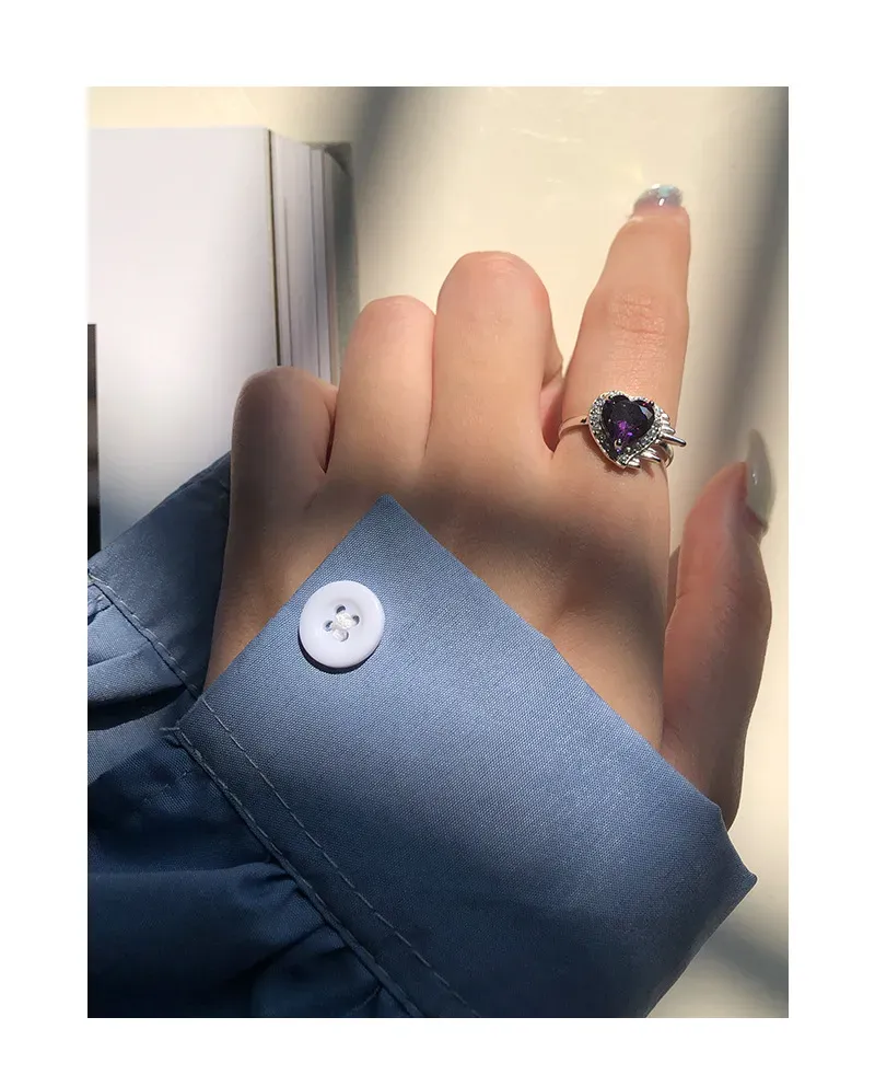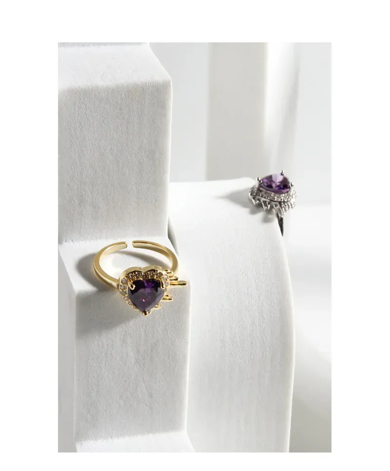 • Color: Adorned with a lustrous gold-tone finish, the Visia Ring cradles a magnificent heart-shaped gemstone in a captivating deep purple. This rich amethyst-like hue is beautifully contrasted and amplified by a halo of brilliant, clear accent stones.
