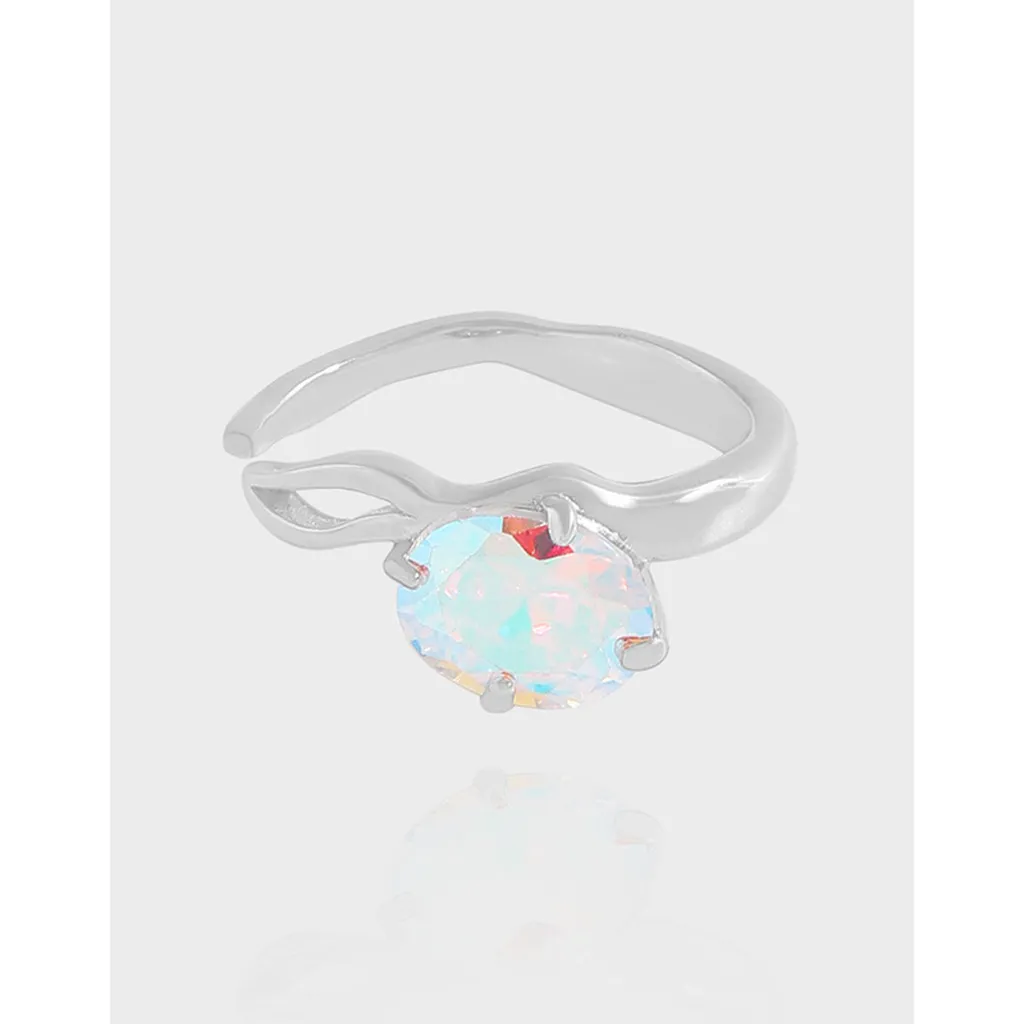 At its heart lies an oval-cut, iridescent gemstone, shimmeVisina Ring with a breathtaking play of colors. This radiant stone reflects luminous hues of soft blues, pinks, greens, and yellows, reminiscent of the aurora borealis, casting a captivating light with every movement.