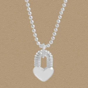 • Patterns or Textures: The accompanying ball chain features smooth, rounded beads that offer a delicate and consistent texture. The pendant itself is a study in contrasting elements, echoing Malisse’s appreciation for “raw textures.” Its upper section showcases finely detailed parallel ribbing, creating an intriguing corrugated pattern that evokes natural formations. Below, the heart-shaped base is flawlessly smooth and highly reflective, providing a beautiful contrast and highlighting its sculptural elegance, reminiscent of the “imperfect beauty of nature’s patterns” rendered in precious metal.