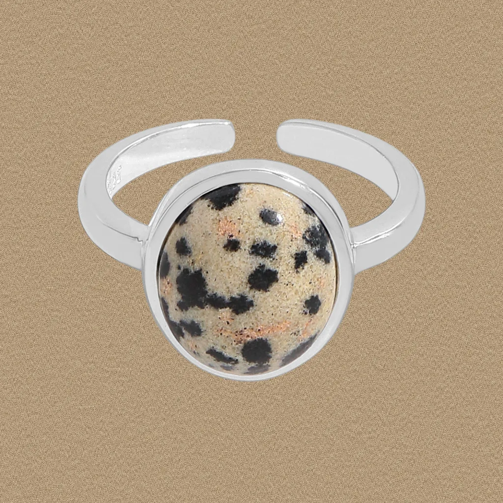 - Patterns or Textures: The smooth, polished surface of the silver band provides a sleek contrast to the mesmerizing patterns of the gemstone. The Dalmatian Jasper boasts a natural, speckled pattern reminiscent of its namesake, with varied black spots against a finely textured, off-white background. The stone’s polished finish allows the intricate, raw beauty of its inherent textures and contrasting hues to truly shine, celebrating the depth of gemstones and the timeless allure of nature’s artistry.