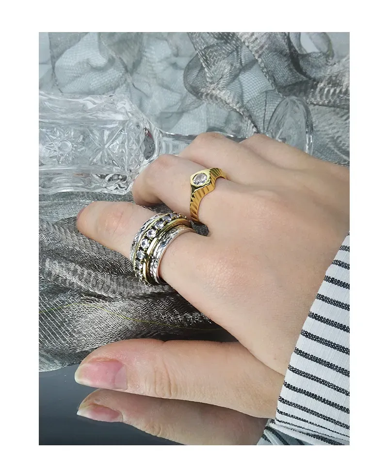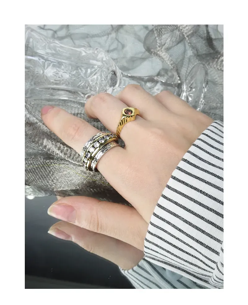 • Patterns & Textures: The ring’s band boasts a distinctive, raw, and imperfectly beautiful corrugated texture along its sides, providing a tactile and visually engaging contrast to the smooth, polished setting of the gemstone. This textured detailing adds to its unique, artisanal character, echoing nature’s own varied patterns.